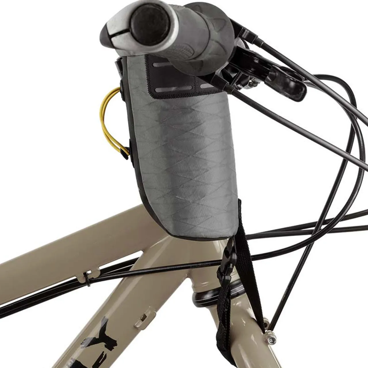 Apidura Food Pouch 1.2 litre is the larger of the 2 food pouches in the Backcountry range. The yellow drawstring closure has an easy-to-use pully and lock system that can be operated with one hand whilst riding along. The 2 soft-back Velcro straps attach it securely to the handlebars without scratching and the 5 location options make it versatile for an assortment of handlebar types. The adjustable loop at the bottom to attach to the fork crown is offset to the back of the pack which keeps the pack vertical when on the bike. The fabric is waterproof and tough, though the drawstring top may allow water to channel in.
