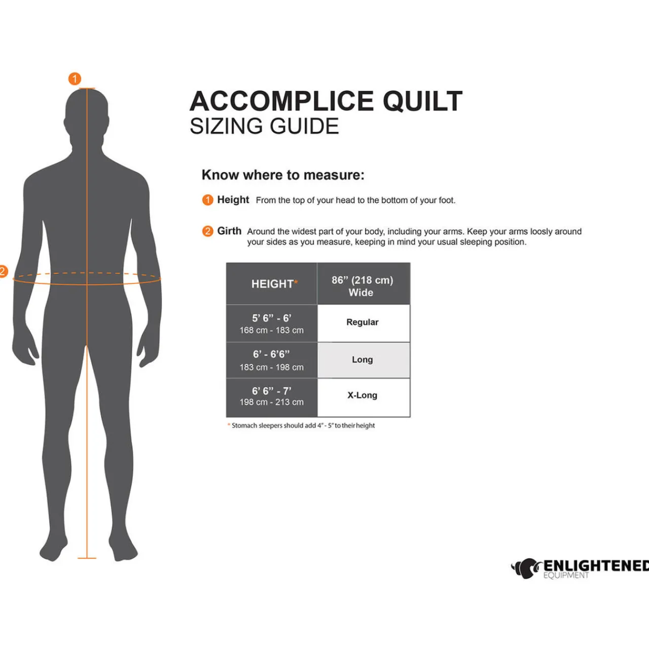 The Accomplice is an incredibly versatile and adaptable two-person quilt; lighter than taking two similar rated quilts, the Accomplice is for couples looking to lighten the load. Both parties share a large and accommodating sown closed-toe box, yet both have individual head openings that can be cinched down or left open depending on each party’s preferred warmth level.