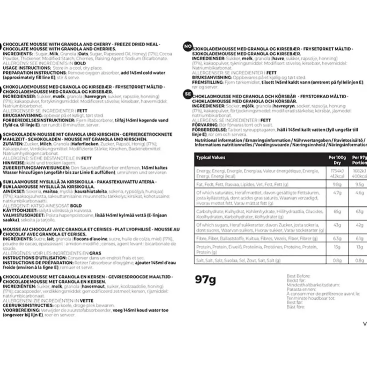 - Chocolate Mousse (White Sugar, Whole Milk Powder, Cocoa Powder, Modified Starch, Raising Agent: Sodium Bicarbonate)(83%), Toasted Oats Clusters (Oats, Sugar, Rapeseed Oil, Honey)(15%), Freeze Dried Sliced Sour Cherry (1.8%)