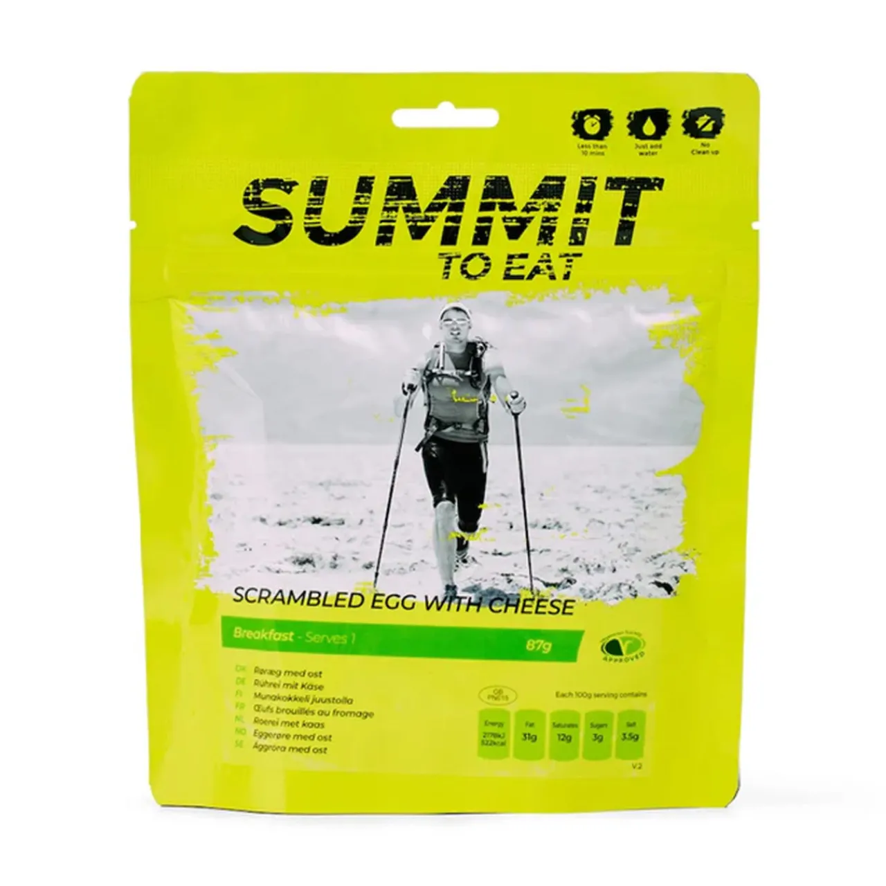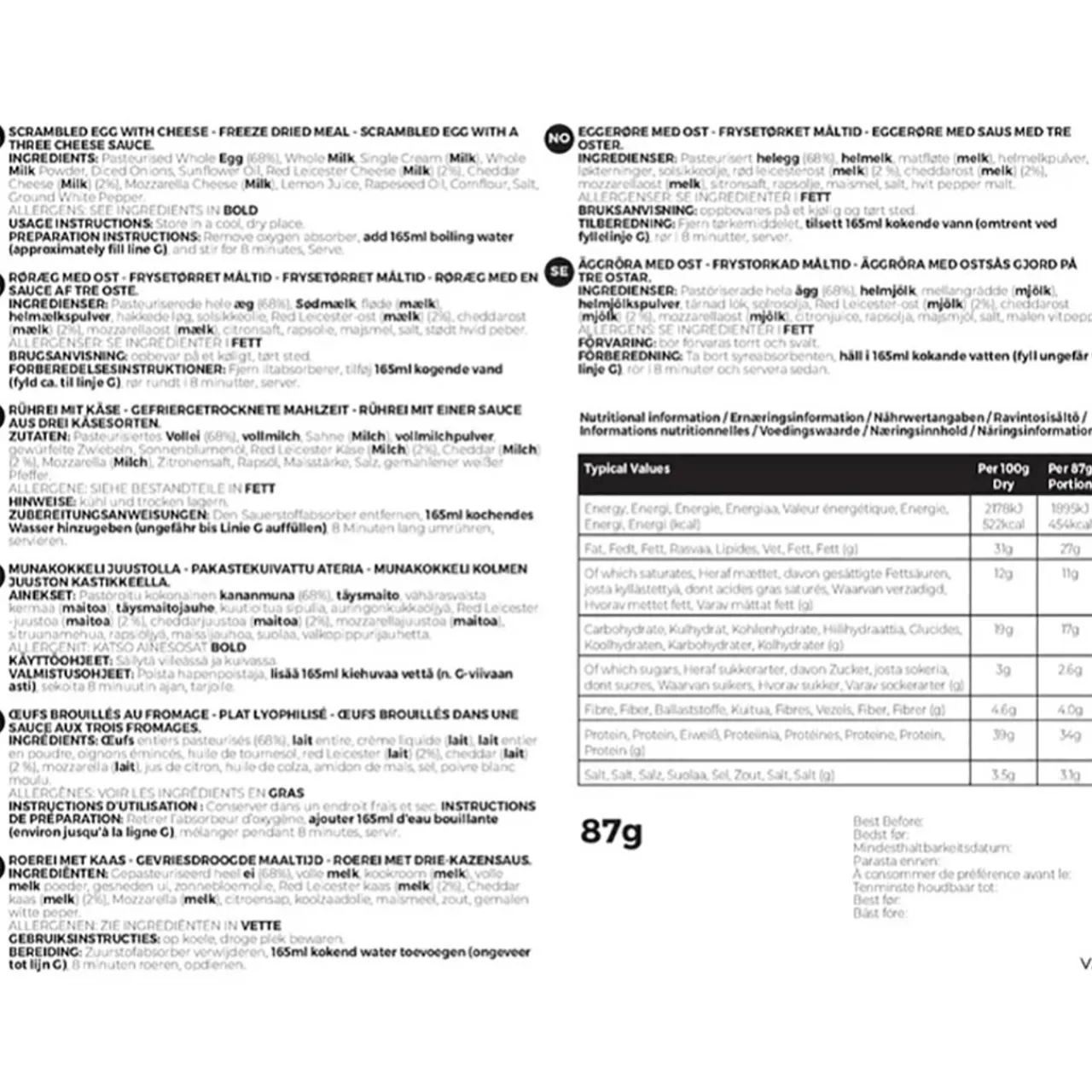 Preparation: Add up to 260ml hot water, stirring as you pour and then close the bag. Wait approximately 8 minutes for the food to rehydrate and enjoy. *Remove the Oxygen Absorber Sachet from inside the pouch first.