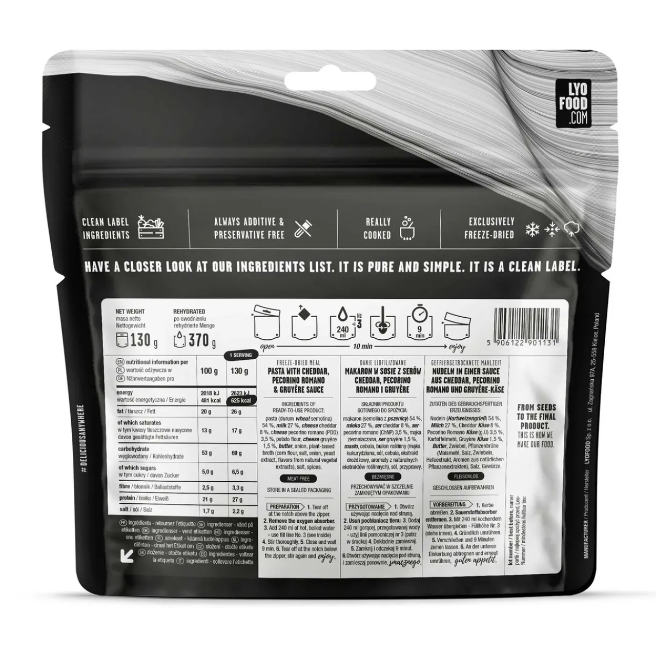 - pasta (durum wheat semolina) 54 %, milk 27 %, cheese cheddar 8 %, cheese pecorino romano (PDO) 3,5 %, potato flour, cheese gruyère 1,5 %, butter, onion, plant-based broth (corn flour, salt, onion, yeast extract, flavors from natural vegetal extracts), salt, spices.