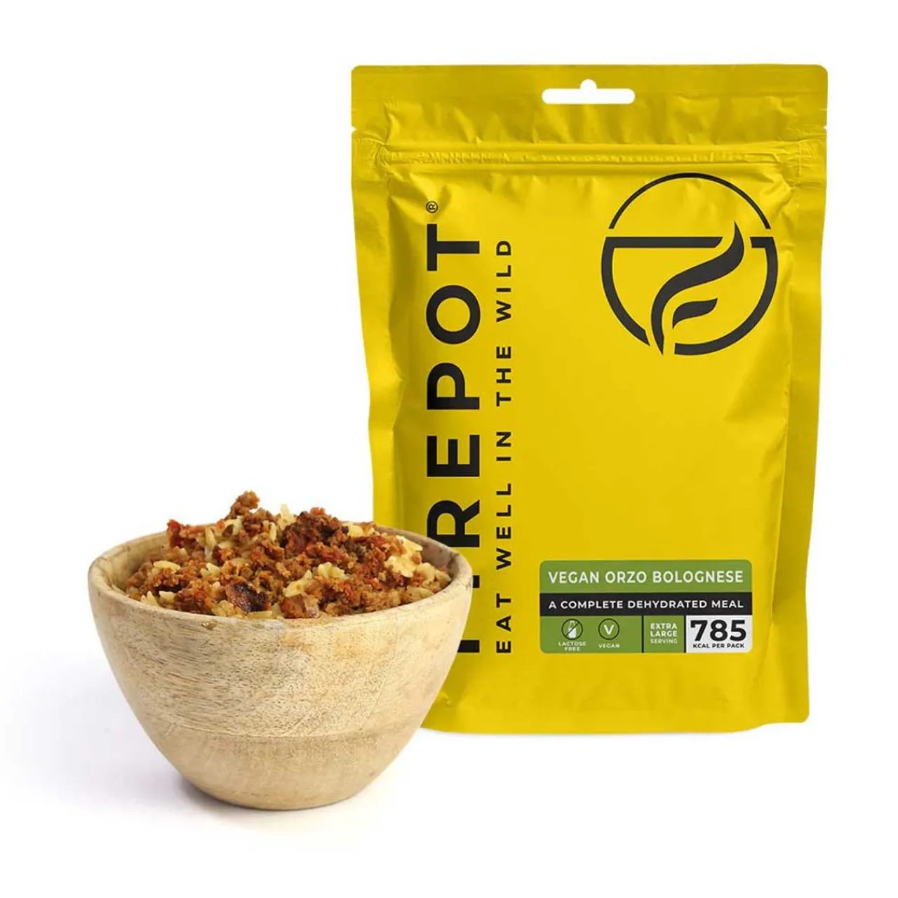 - TVP mince (soya beans, caramel), orzo pasta (durum wheat semolina), tomatoes, onion, garlic, tomato puree, olive oil, mushroom stock (mushroom concentrate, yeast extract, sugar, cornflour), salt, oregano, pepper, star anise, bay leaves, citric acid.