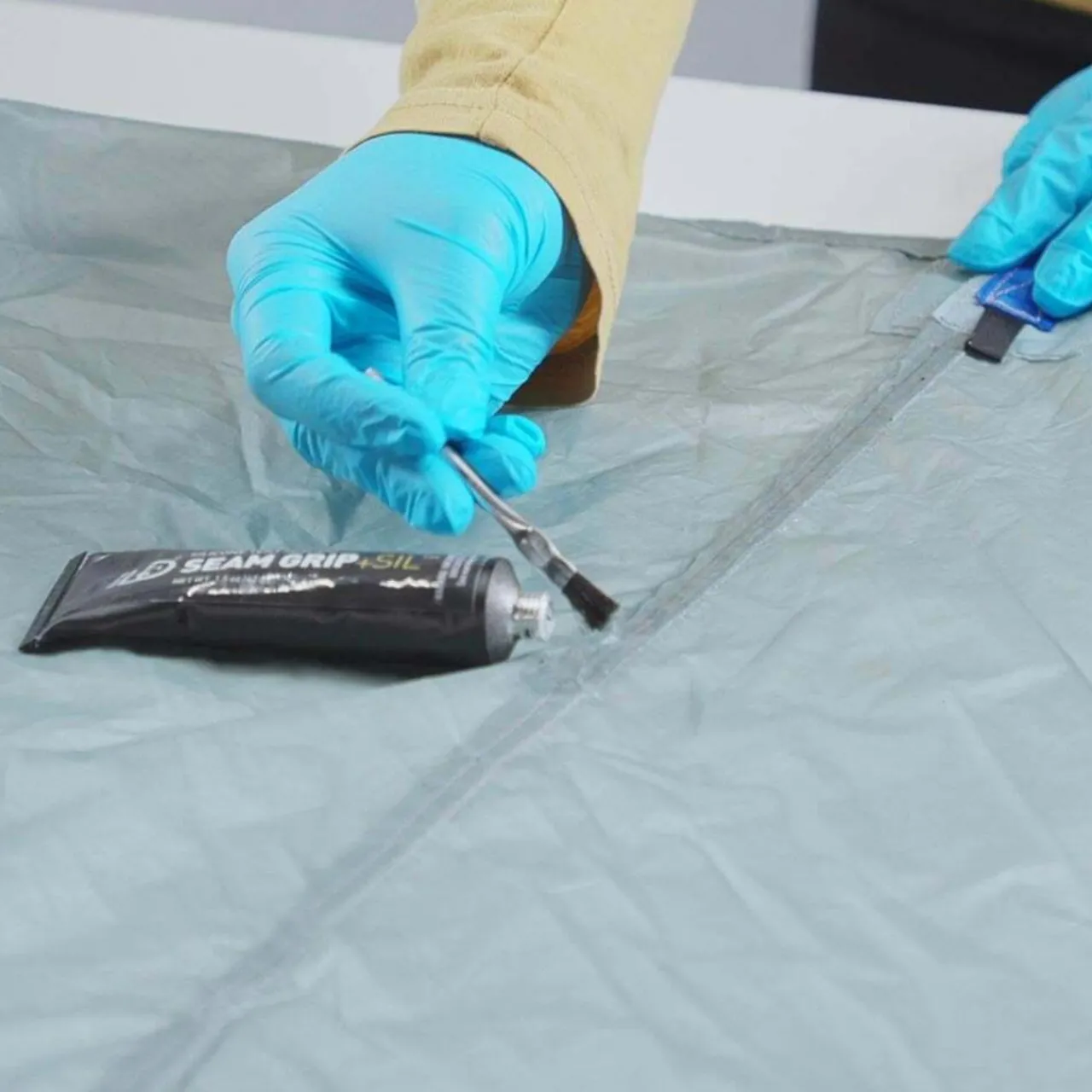 Seam sealing with Seam Grip SIL is the best way to keep moisture out when using a silnylon (silicone-nylon) tent. Previously known as SilNet, this clear sealant dries to a flexible rubber that works on all silicone treated gear including nylon tarps and ultralight backpacks. One tube can seal up to 24 ft of seams. Fast and easy to use, it’s also handy for pinhole repairs and small tears. When you need to waterproof a silnylon tent only a silicone sealant will work, because silicone will only adhere to silicone. So, treat gear right and seal out the weather with Seam Grip SIL.