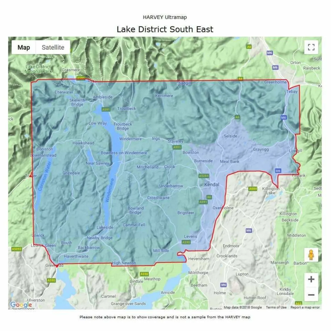 The map has Lake Windermere in the centre. Includes Ambleside, Coniston and Kendal and the superb mountain biking area of Grizedale Forest.
