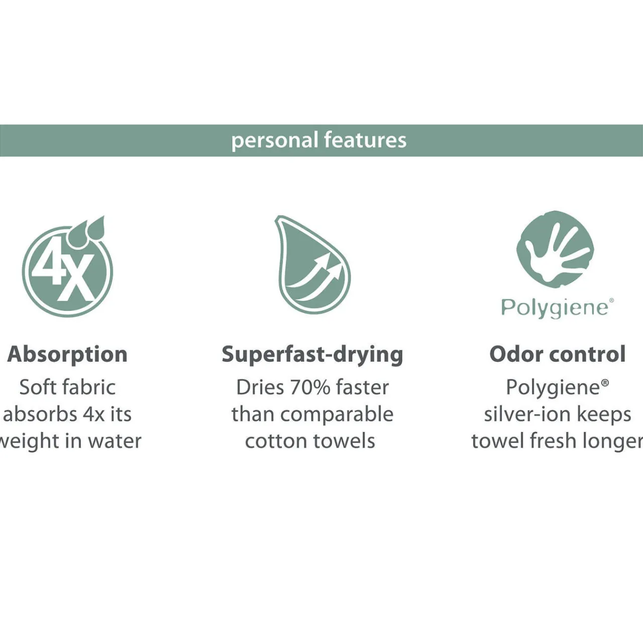 The Personal Towel is our best-selling camp and travel towel. Sustainably made of 50% recycled fabric, the Personal takes up minimal space in your backpack, luggage or car and delivers maximum absorbency and quick-drying performance. Capable of absorbing 4x its weight in water and drying 70% faster than comparable cotton towels while taking up a fraction of the space, the Personal is perfect for camping, travel, the gym, the yoga studio and around the house. Machine washable, and with Polygiene® odor control, the Personal is always fresh and ready for your life on-the-go.