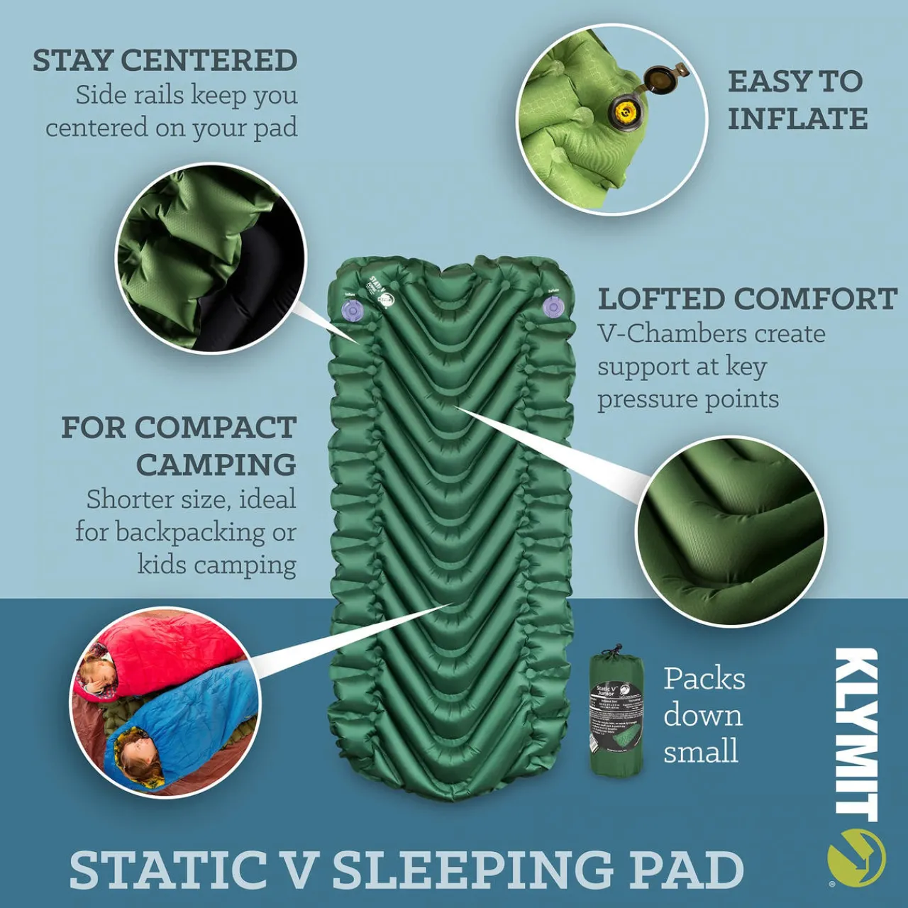 The Klymit Static V Short is a lightweight camping pad using body mapping technology at an entry level price. It features the V-Chamber design which limits air movement and heat loss while offering a uniquely ergonomic body map which is optimzed for performance and comfort.
