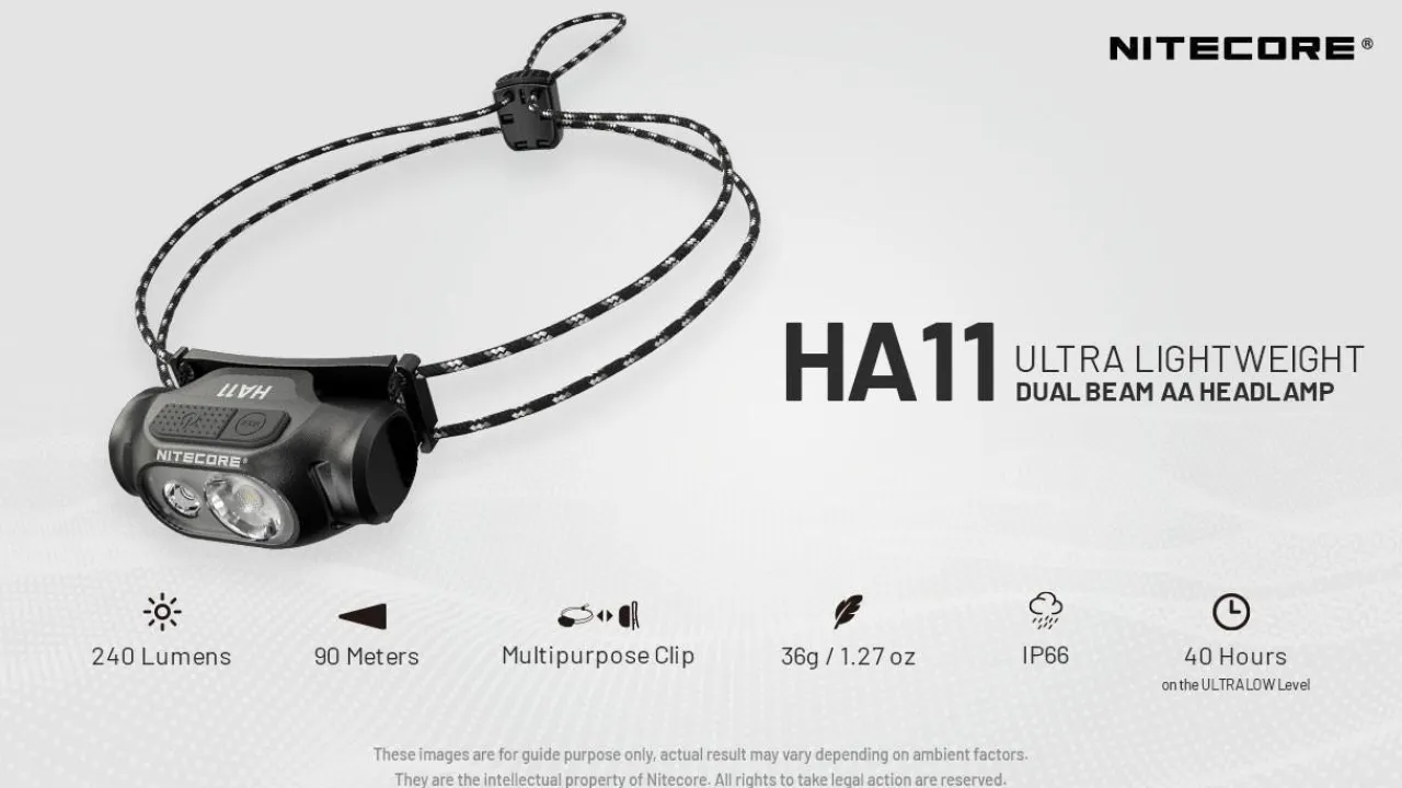 The Nitecore HA11 headlamp has a maximum output of 240 lumens from the white LED and is powered by a single AA battery. The light utilises a unibody optical lens system with various facets, achieving excellent performance in a compact size.