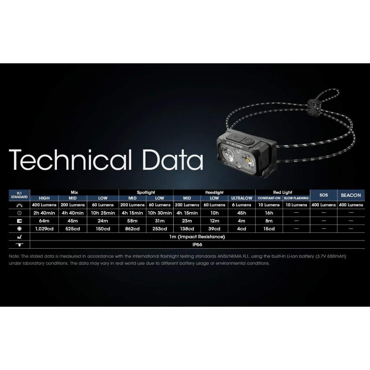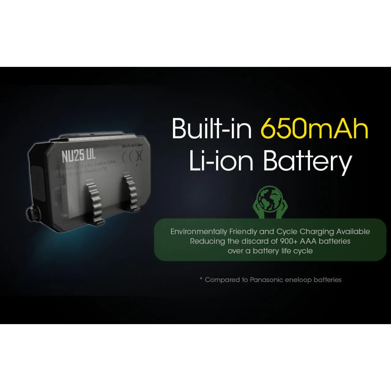 The Nitecore NU25 UL head torch is an ultra lightweight version of the new NU25. Offering a maximum output of 400 lumens from the high performance LEDs and powered by a built-in 650mAh li-ion battery, the headlamp provides excellent ease and convenience.