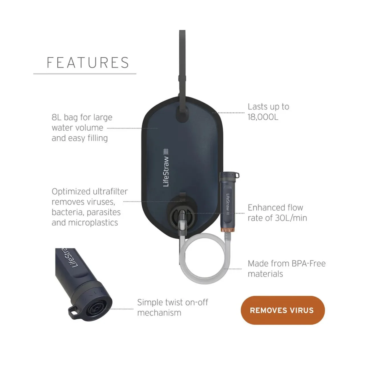 - INCLUDES: 8L gravity bag with carry strap and carabiner, 1.2m hose, Ultrafilter membrane, adapter to enable direct filling of water bottles with 28mm standard threading, prefilter basket, leakproof cap and backwash syringe