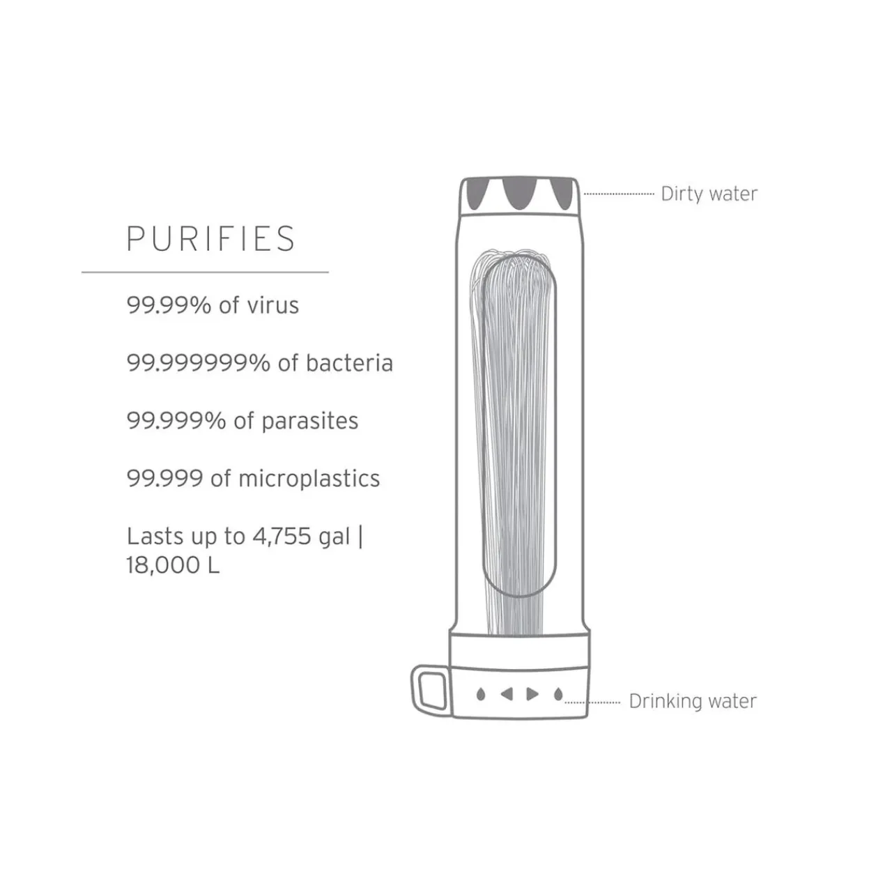 - REMOVES VIRUS, BACTERIA + PARASITES: the Ultrafilter Membrane protects against viruses (Rotavirus, Hepatitis A), Bacteria (including E.coli + Salmonella), Parasites (including Giardia and Cryptosporidium), Microplastics, sand, dirt, and cloudiness