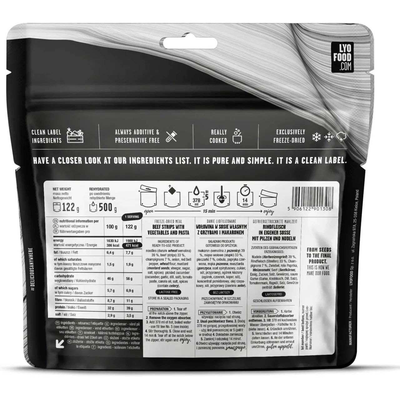 - “noodles (durum wheat semolina) 39 %, beef (strips) 33 %, champignons 7 %, onion, red bell pepper, wheat flour, mustard (mustard seeds, vinegar, sugar, salt, spices) pickled cucumber (cucumber, garlic, dill, salt), tomato paste, canola oil, salt, spices (contain celery).
