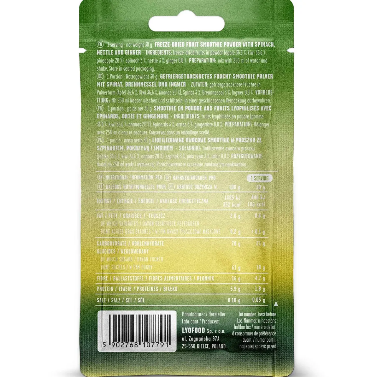- freeze-dried fruits in powder (apple 36,6 %, kiwi 36,6 %, pineapple 20 %), spinach 3 %, nettle 3 %, ginger 0,8 %