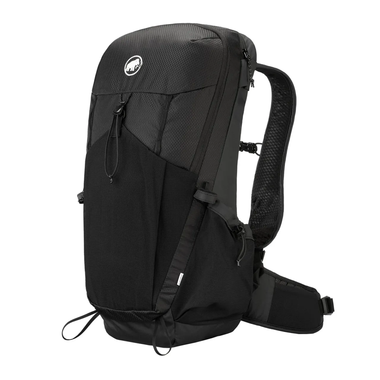 Storage is simple but smart. A large front stretch pocket easily accommodates wet layers or bulkier items, and the side mesh pockets are just the right size for bottles or trail food. The hip belt has a single secure pocket, and there’s a stash spot up front with a key clip. I’m always glad to see proper shoulder strap pockets — ideal for soft flasks, a phone, or a bar, all within easy reach. The included rain cover is neatly integrated and easy to deploy when needed.