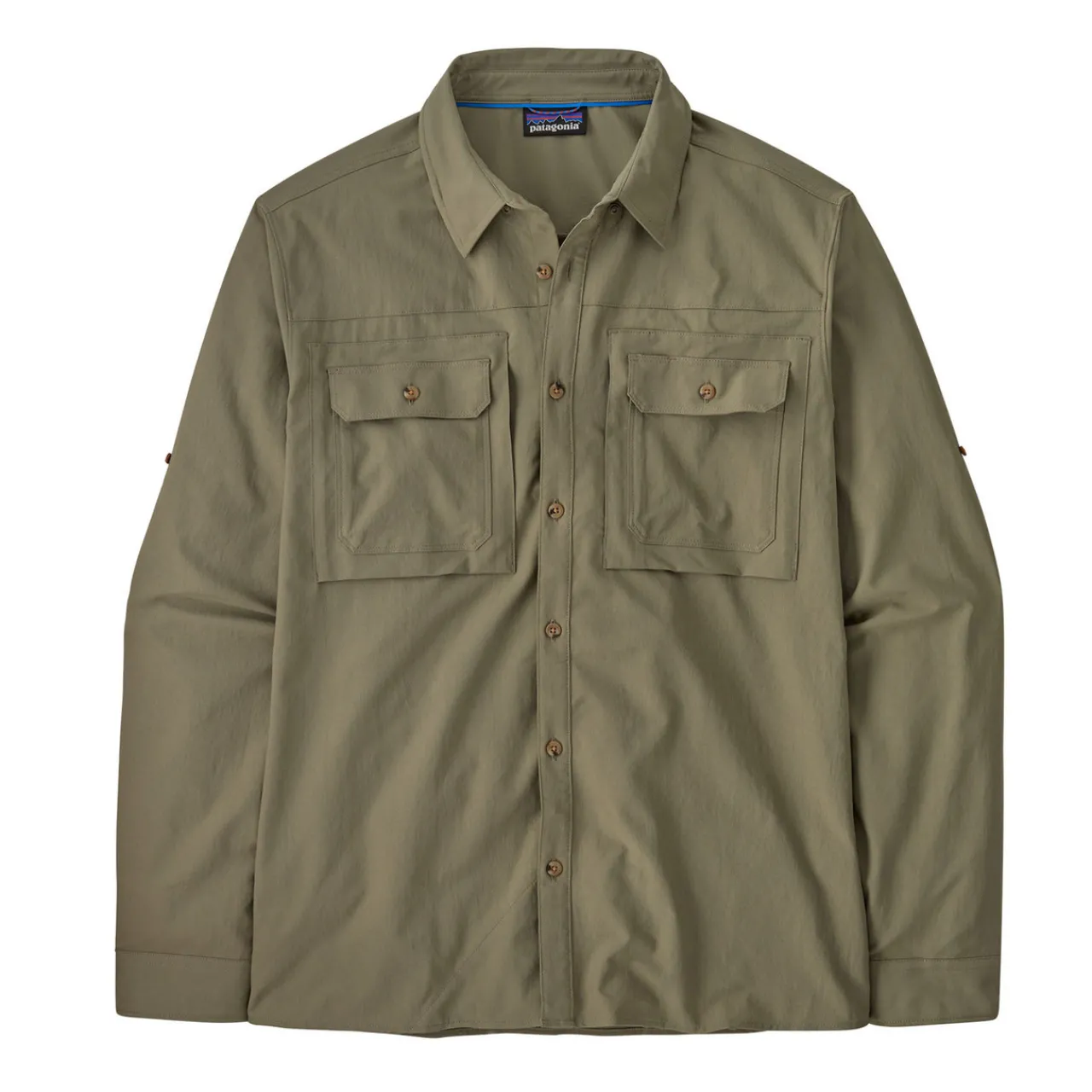 Patagonia’s Long-Sleeved Self-Guided Sun Shirt is one of those shirts that genuinely balances function and comfort on hot, active days. At 237g (size M), it’s made from 100% recycled polyester with mechanical stretch, offering good freedom of movement and impressively quick drying. The UPF 40+ rating is reassuring when you’re in and out of direct sun. I particularly appreciate the open venting across the back—it noticeably improves airflow when things heat up. The double-layer collar stands up neatly for extra neck coverage, a welcome feature on bright, windless ridges.