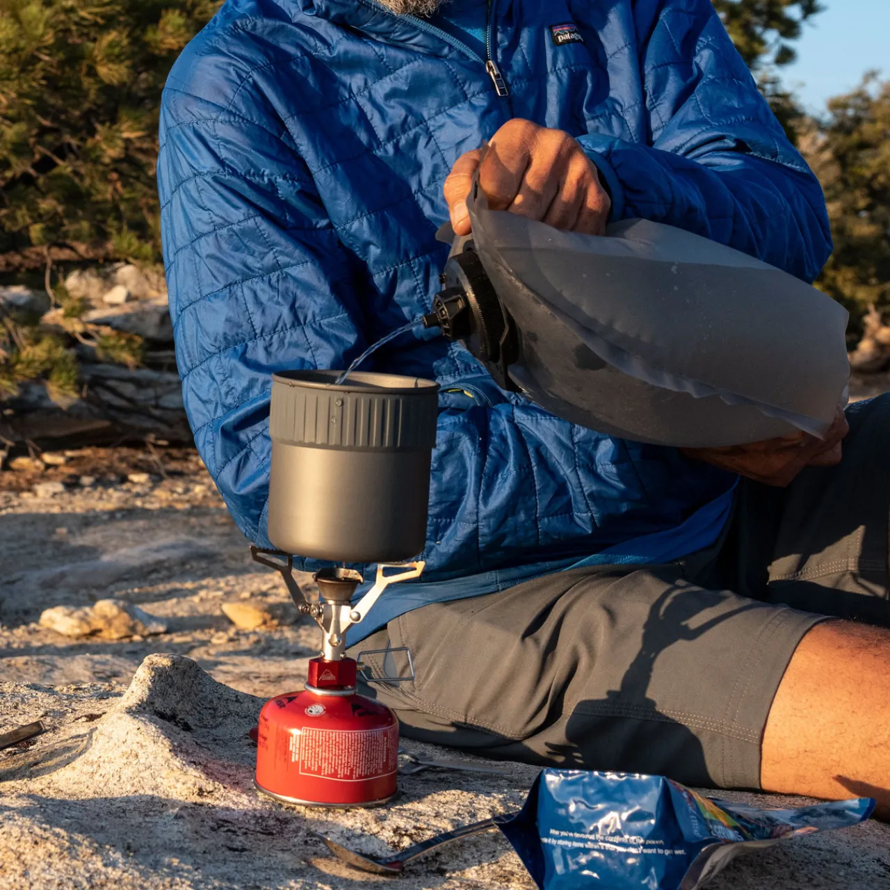 For efficiency, its pot doubles as your eat-and-drink vessel and nests the stove and a 4 oz MSR fuel canister (sold separately). Outside, the extra bowl comes at no packing penalty. When small packs are mandatory on everything from alpine objectives to bikepacking missions, this micro cook kit is your ally.