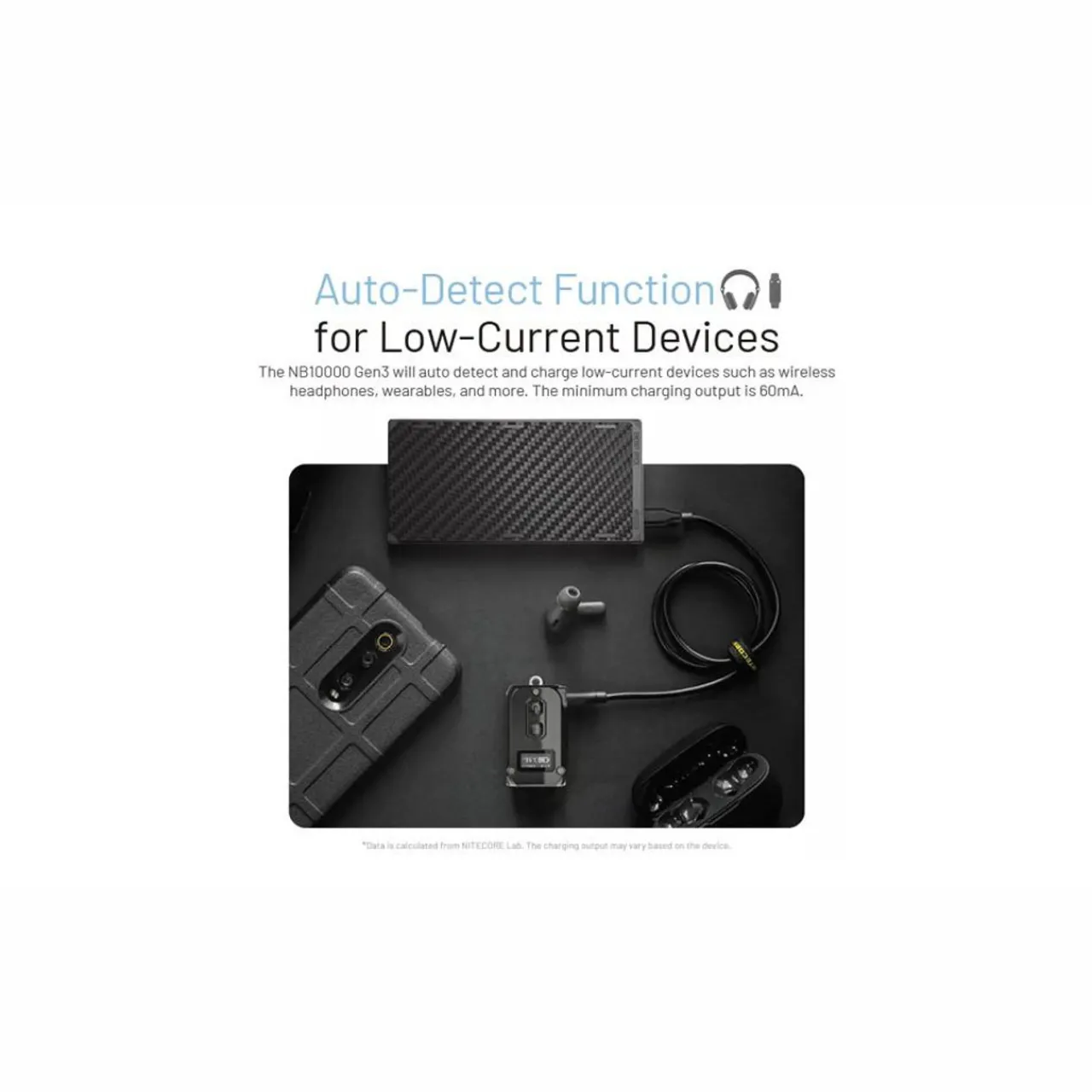 - The power bank comes with a USB-C to USB-A adapter to ensure it will fulfil your charging needs and power most electronic devices. It has a low current setting which will automatically detect devices such as wireless headphones and wearables with a minimum charging output of 60mA.
