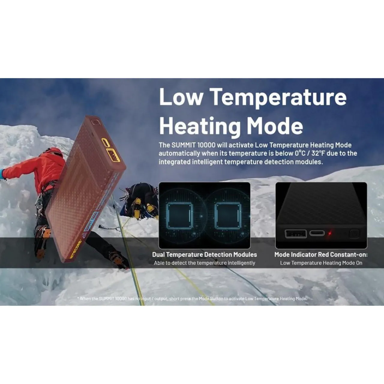 The Nitecore Summit 10000 is a rugged, low-temperature power bank designed for outdoor adventures. With 10,000mAh capacity and carbon fibre construction, it operates down to -40°C/-40°F. The PI heating system ensures efficient battery performance in cold conditions. Lightweight at 172g, it features USB-A/C ports, 20W max output, and multiple safety protections. Water-resistant and impact-resistant, the compact Summit 10000 delivers reliable power for charging devices like phones, headlamps, and cameras during mountaineering, skiing, and extreme expeditions. Its advanced thermal management and durable build make it ideal for harsh winter environments.