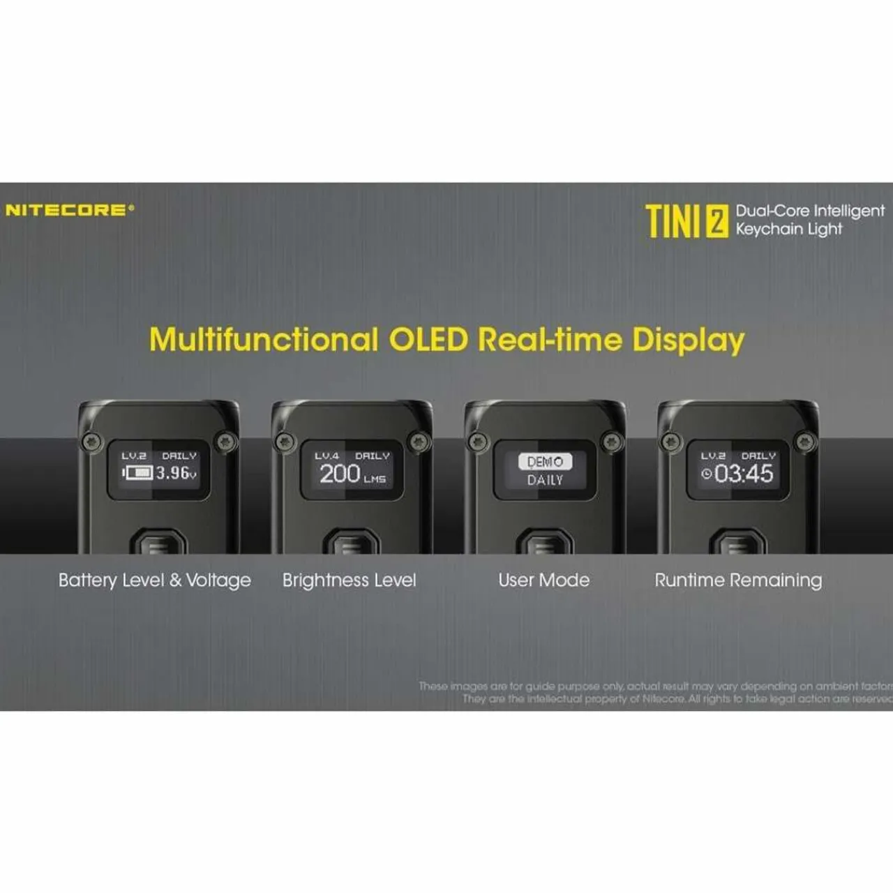 The TINI 2 features a multi-functional OLED display screen which provides real-time information on the battery voltage, brightness level, user mode and remaining runtime.