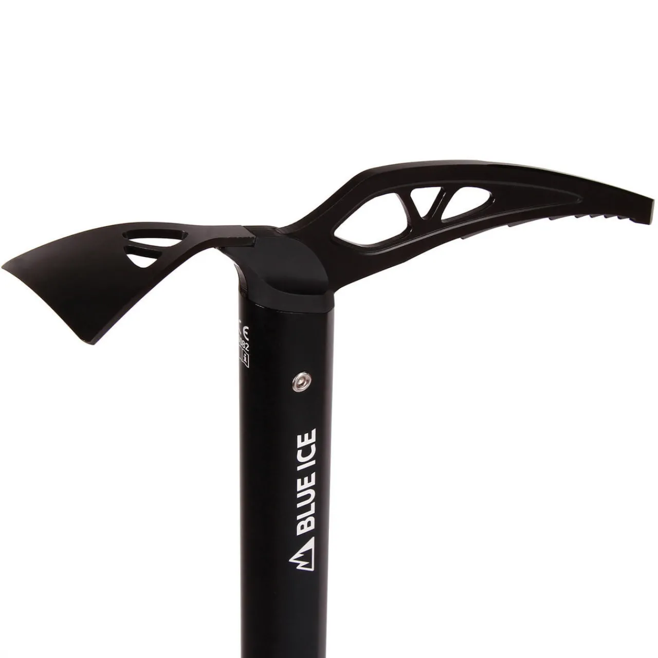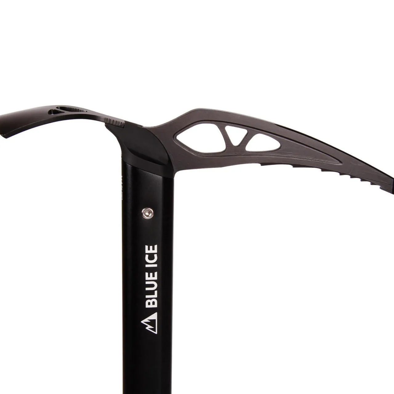 The Blue Ice Blackbird is an excellent all-around ice axe for classic mountaineering routes and glacier approaches. Its straight chromoly steel head offers impressive durability and strength for solid placements while keeping weight respectably low between 359-392g depending on length. The hot-forged pick and adze are ergonomically shaped for efficient climbing and chopping.