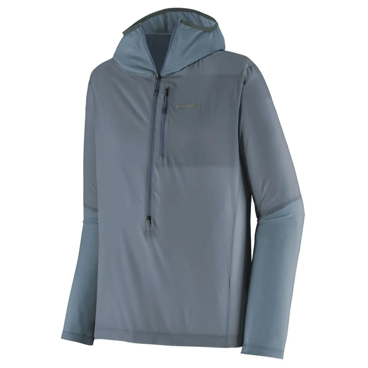 The Patagonia Airshed Pro Pullover is a lightweight, packable wind shirt with breathable fabric and a water-resistant finish. It features a stretch-knit hood and sleeves for comfort and a two-way zipper for ventilation.