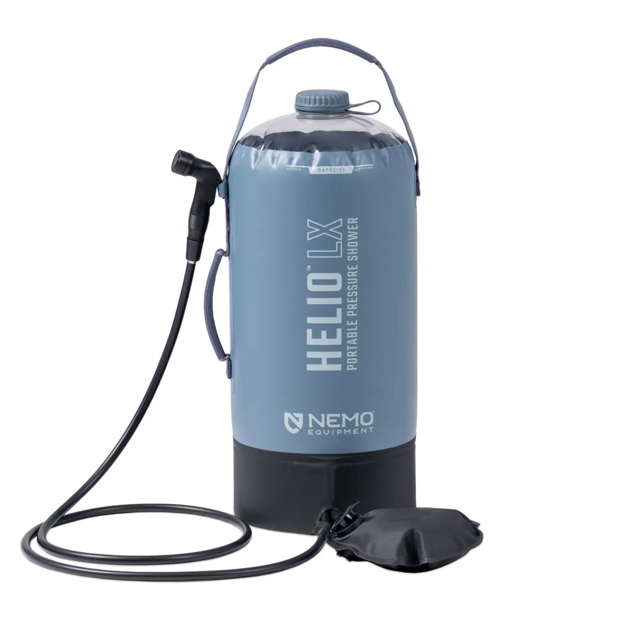 Helio LX’s 5.8-gallon vertical reservoir is equipped with a large port and easy-grip screw cap for effortless filling and emptying of the tank. (Bonus: The large opening aids with fully drying and cleaning the interior, as well.) Attached to the reservoir is a 7-foot-long neoprene hose with two-stage nozzle that can be manually triggered or set to continuous spray mode for tasks like showering or camp dishes. The extra-long hose is designed to especially complement our Heliopolisâ„¢ privacy shelter & shower tent, which has a fitted nozzle holder for a hands-free shower experience for luxury in the backcountry.