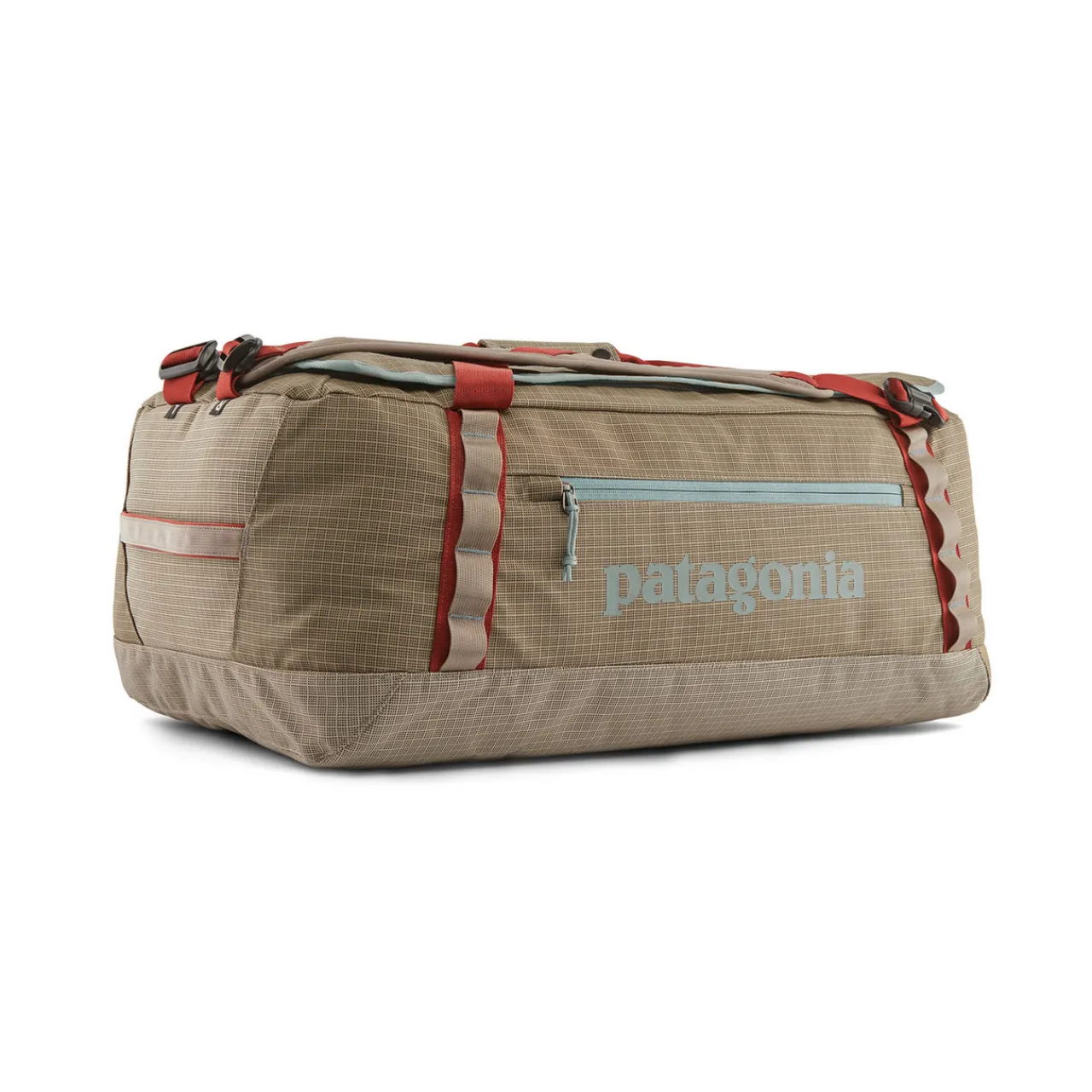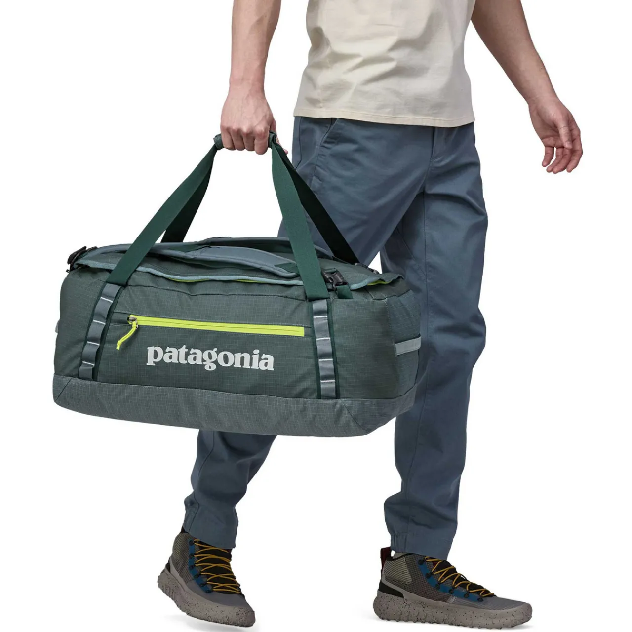 The Patagonia Black Hole Duffel 55L is a durable, eco-friendly bag. It has a large capacity and is made from recycled materials. It is weather-resistant and has well-designed features, such as removable backpack straps and zippered side access.