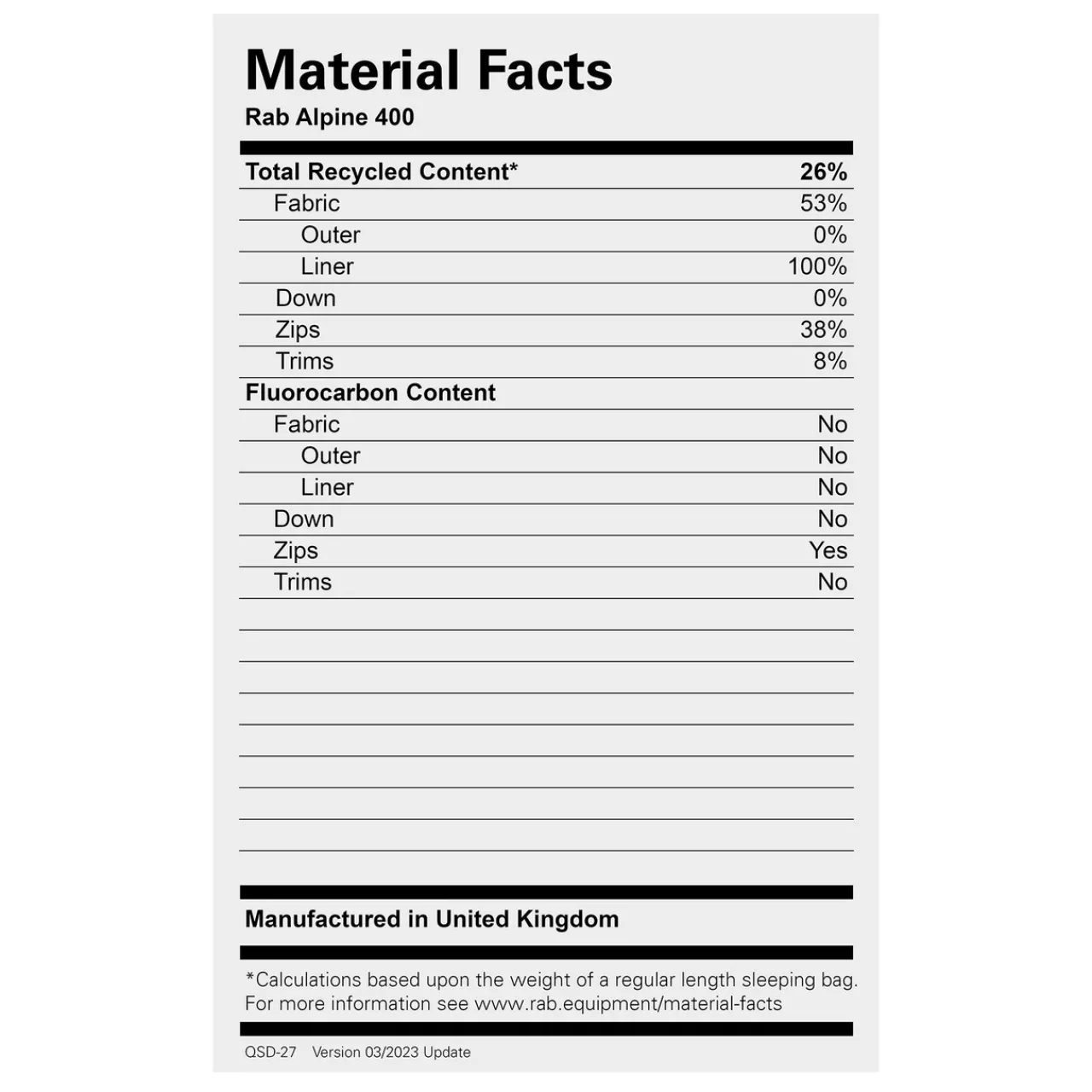 Rab’s Alpine 400 Down Sleeping Bag fits in the Alpine series which are filled with 650 Fill Power down contained in a trapezoidal boxwall baffle construction with a differential cut to eliminate cold spots. The slightly lower down quality compared to their premium bags makes these bags more affordable but they are still a technical bag.