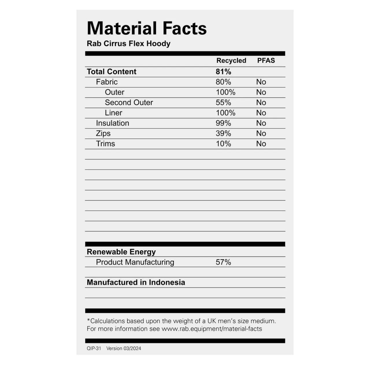 - 20D Recycled Pertex® Quantum lining (38gsm) with fluorocarbon free DWR