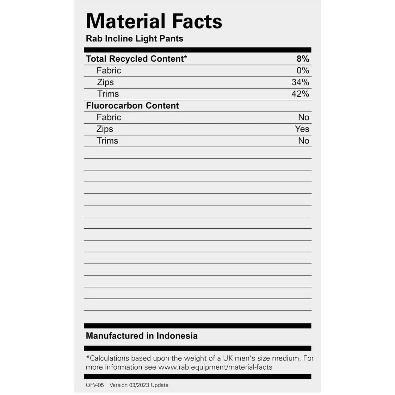 The Incline uses the Matrixâ„¢ fabric which offers a superb level of stretch and mobility for romping up steep hills and scrambles without restriction of movement. the lightweight nature of the fabric also makes them comfortable to be worn all day in warmer conditions, while being very breathable preventing moisture build up and that uncomfortable cold sensation when you have to stop.Â