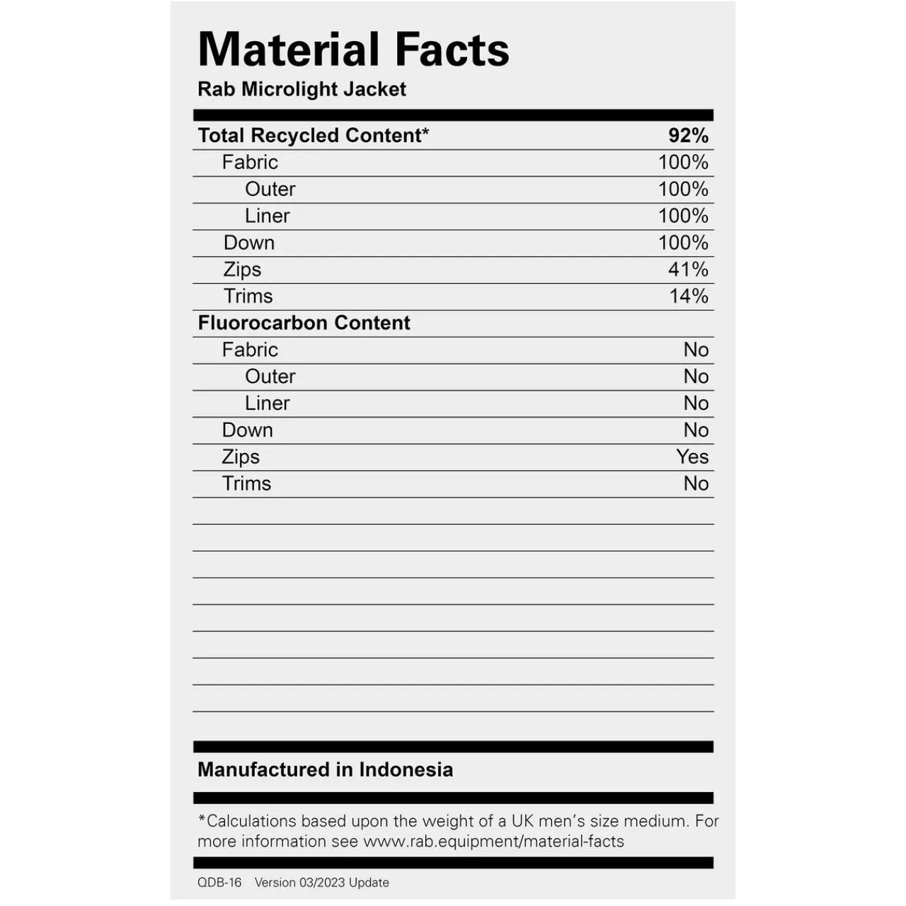 - Main Fabric: Recycled 30D nylon Pertex Quantum, 50g/m², with DWR