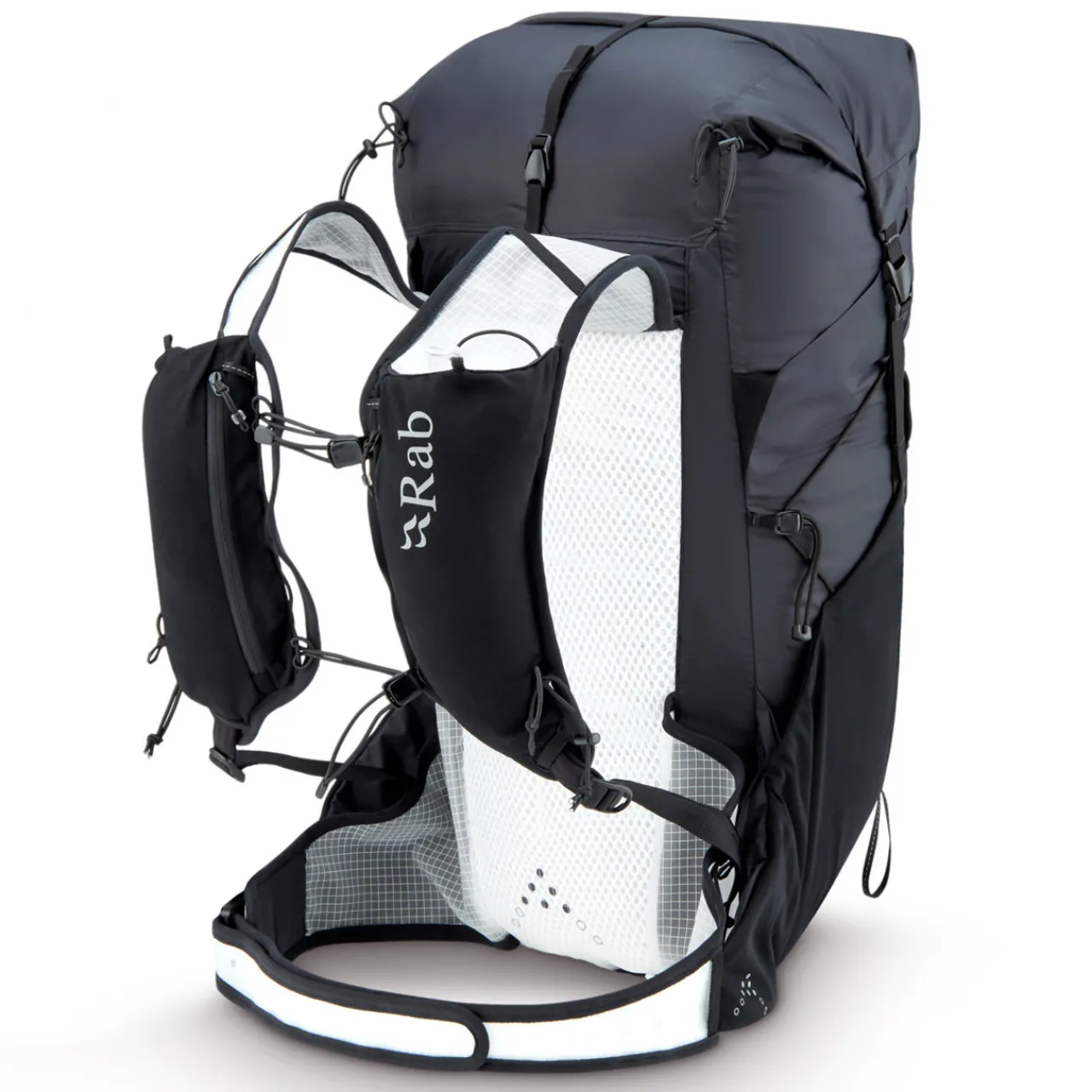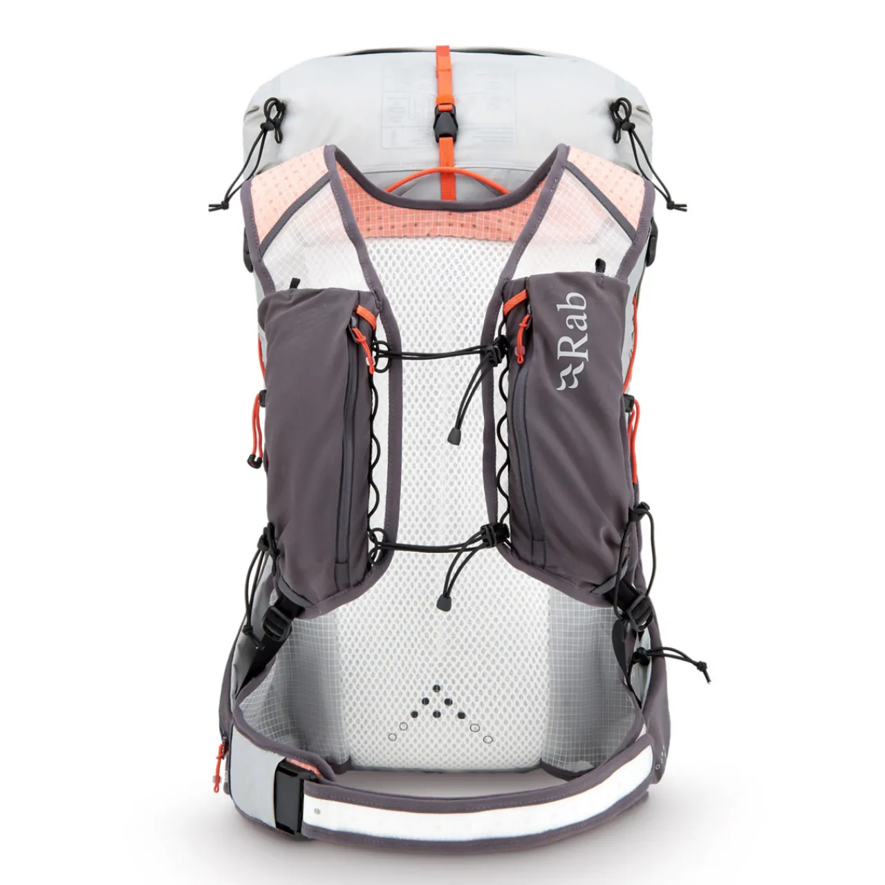 I’m not a mountain marathon runner, but as a minimalist wild camper, I was genuinely excited about this pack—and it didn’t disappoint. Weighing in at around 545g, it’s impressively light, yet handles a full load confidently thanks to its close-fitting, vest-style harness. Each side of the harness can hold a 500ml soft flask and also features a zipped pocket for quick-access essentials. Rab’s ultra-breathable mono-mesh on the harness, paired with a 3D spacer mesh back panel, keeps things cool, dry, and stable when you’re on the move.