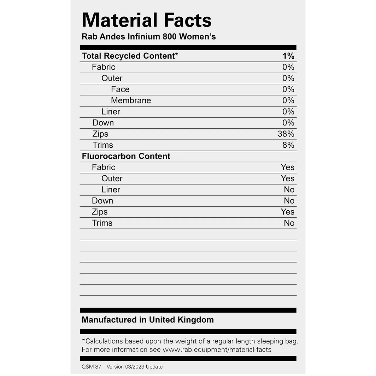Rab’s Womens Andes Infinium 800 Down Sleeping Bag fits in the Andes series which are Expedition class sleeping bags filled with premium 800 Fill Power down contained in a trapezoidal boxwall baffle construction with a differential cut to eliminate cold spots.