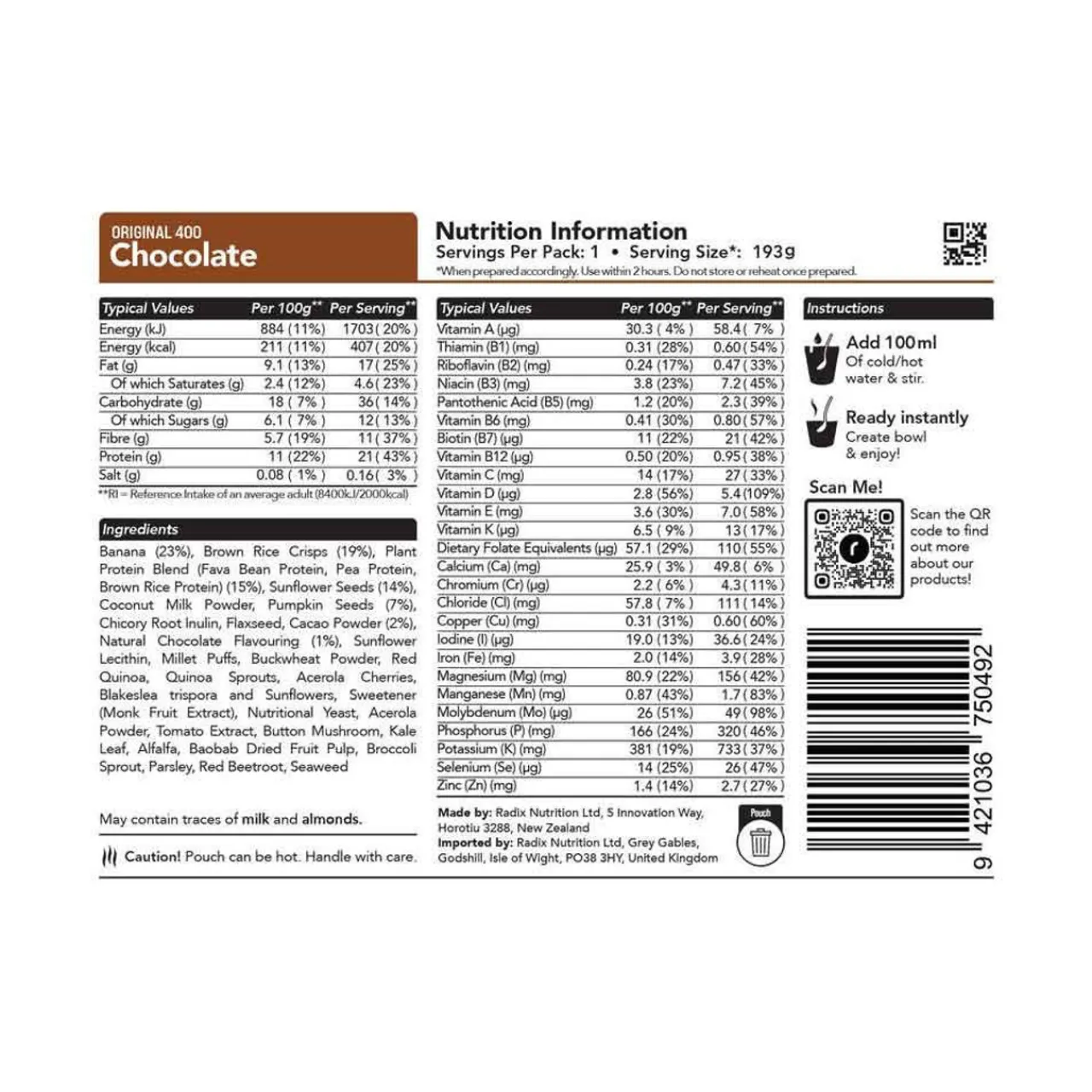 Radix Nutrition offers a wide range of meals and energy servings. The Original range of meals is available in 400 calories for the breakfasts and 600 calories for the main meals, sufficient for most people’s appetites. However, a higher energy serving, the ultra range, offers 800kcal meals to those with bigger appetites and those pushing themselves further and need more energy.Â