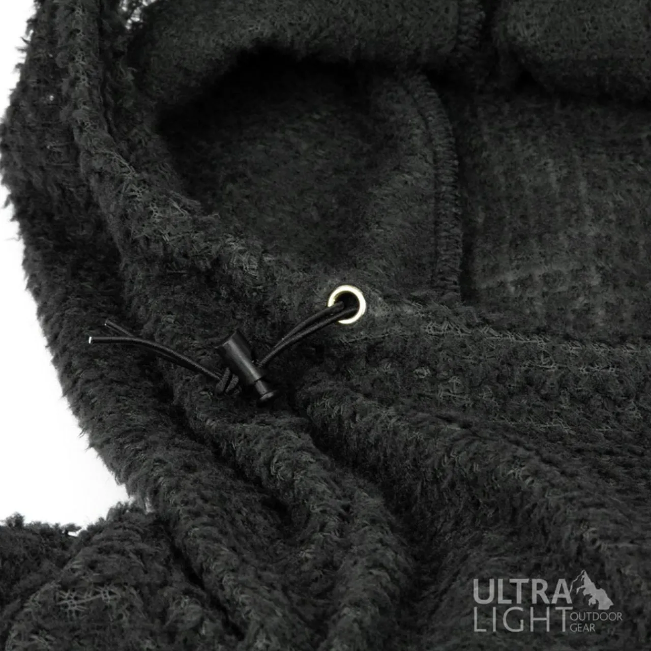 The Sambob Alpha 90 Hoodie uses Polartec Alpha Direct (90gsm), a fabric known for its excellent breathability and warmth during high-output efforts. The wide fit is effectively the men’s version, with a straighter cut and slightly more room in the torso. At around 150g (size large), it’s a fantastic insulation piece for cool-weather hiking, or as a midlayer under a wind shell. The hood includes a simple drawcord adjustment that adds a nice touch of weather protection, especially useful when layering under a wind jacket. The fabric is incredibly soft, wicks moisture well, and dries fast—but it’s delicate and must be treated carefully to avoid snags. The open structure makes it exceptionally thermoregulating, though wind can cut through it if worn alone.