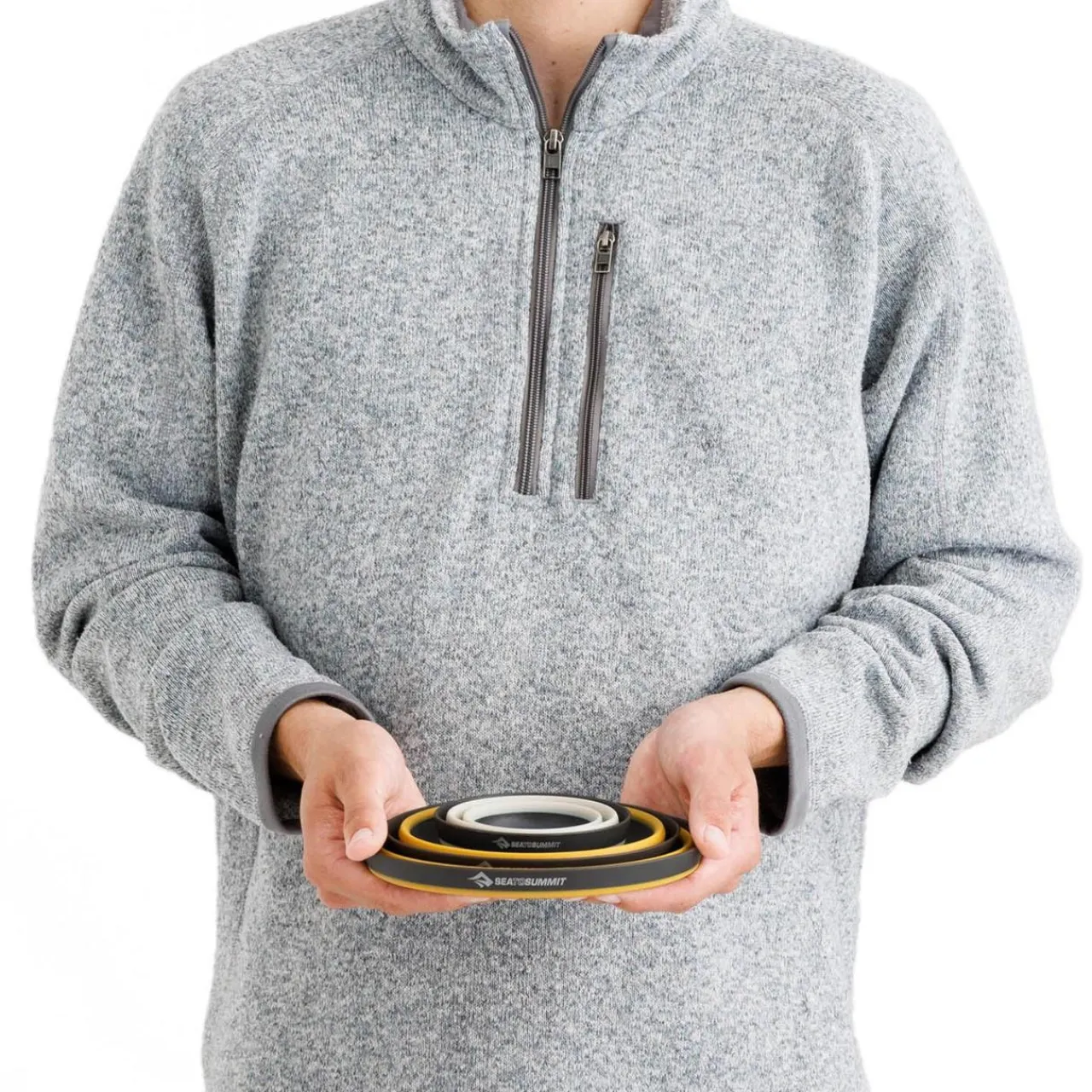 The Sea to Summit Frontier UL Collapsible Dinnerware Set includes a large bowl, medium bowl, and a cup, all designed to flatten to just 17mm. Each piece is made from food-grade silicone with glass-reinforced nylon rims and bases, which give the bowls and cup enough structure to stand firm when full — no awkward collapsing mid-meal. The curved shape inside the bowls pairs nicely with Sea to Summit’s cutlery, letting you scrape them clean without chasing your food around the edges. The cup’s Cool-Grip sides work well for hot drinks, and the whole set nests together for tidy packing. I’ve found it tough, practical, and properly thought through — a far cry from the flimsier collapsible kits I’ve used in the past.