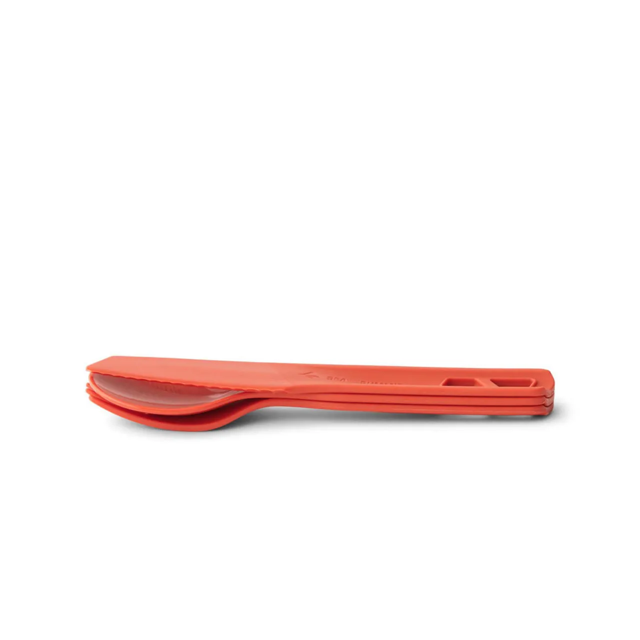 The Passage Cutlery Set is a lightweight and robust cutlery set crafted from food-grade polypropylene, resulting in a smooth finish and simple cleaning. The utensils are compact, enabling them to fit effortlessly into most cook kits. Additionally, they have a clipping mechanism that extends their length, making them long enough to reach the bottom of dehydrated food packets, enhancing their versatility.