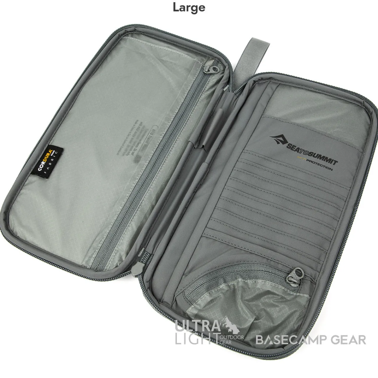 - Large: Eight credit card slots, two large sleeves, pen holder, zippered coin pouch and an external pocket for boarding
