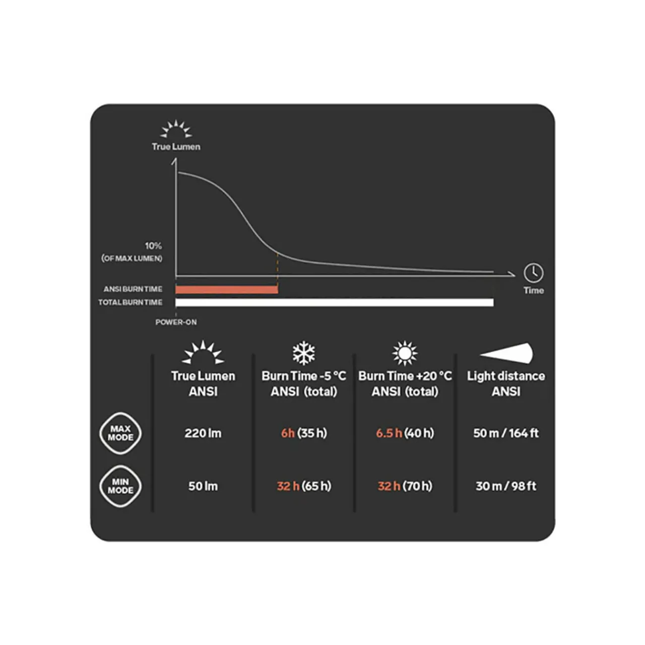 - Max Mode: 220 lumens / 50 metres, 164 ft / 6 hours (-5C), 6 hours 30 min (+20C) Burn time
