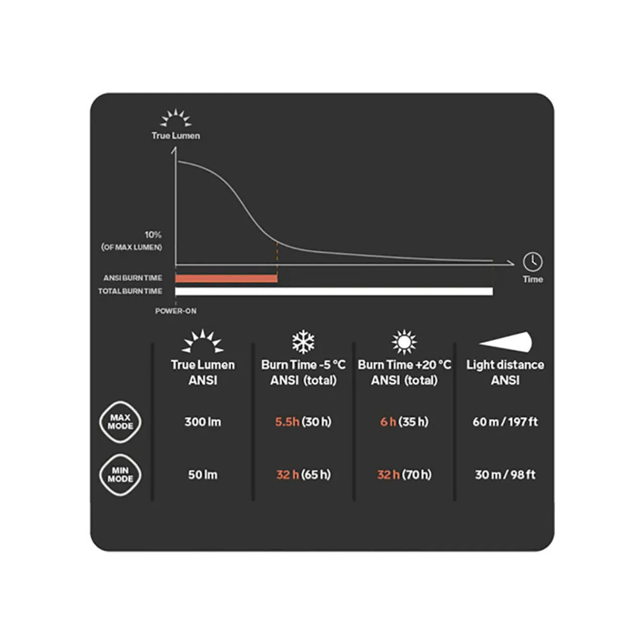 - Max Mode: 300 lumens / 60 metres, 197 ft / 5.5 hours (-5C), 6 hours (+20C) Burn time