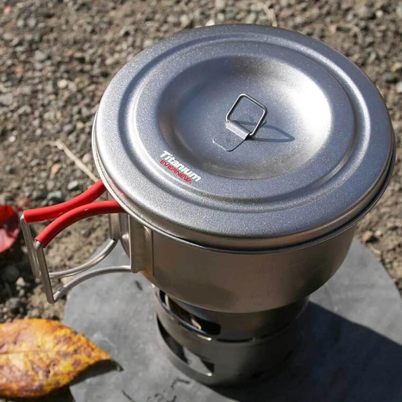 Lightweight titanium cup with foldable handles. Gradations are stamped for easy measurement. Large surface area improves heating efficiency.