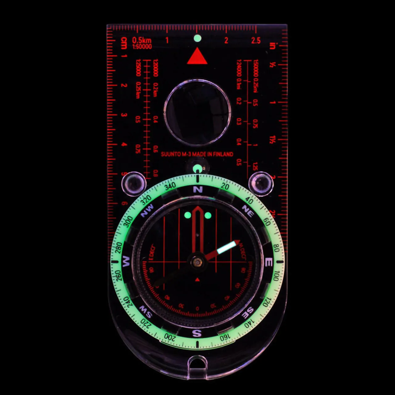 The Suunto adventure compass is designed for navigating in extreme outdoor conditions. It boasts a rugged construction with a plastic bezel, high-grade steel needle, and liquid-filled capsule for stable operation. The luminescent markings and magnifying baseplate allow you to use the compass easily in low-light conditions and read maps conveniently. Both metric and imperial scales are included for versatility.