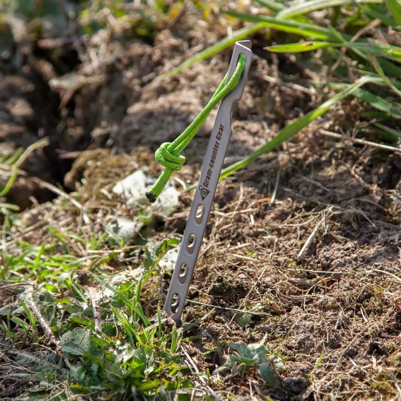 Gram-counter Gear’s Titanium V Peg is designed to go in softer ground, sand and even snow. The V shape of these pegs give them a bigger surface area to keep them stuck in place. Place them with the point of the V away from the tent to get the strongest hold.