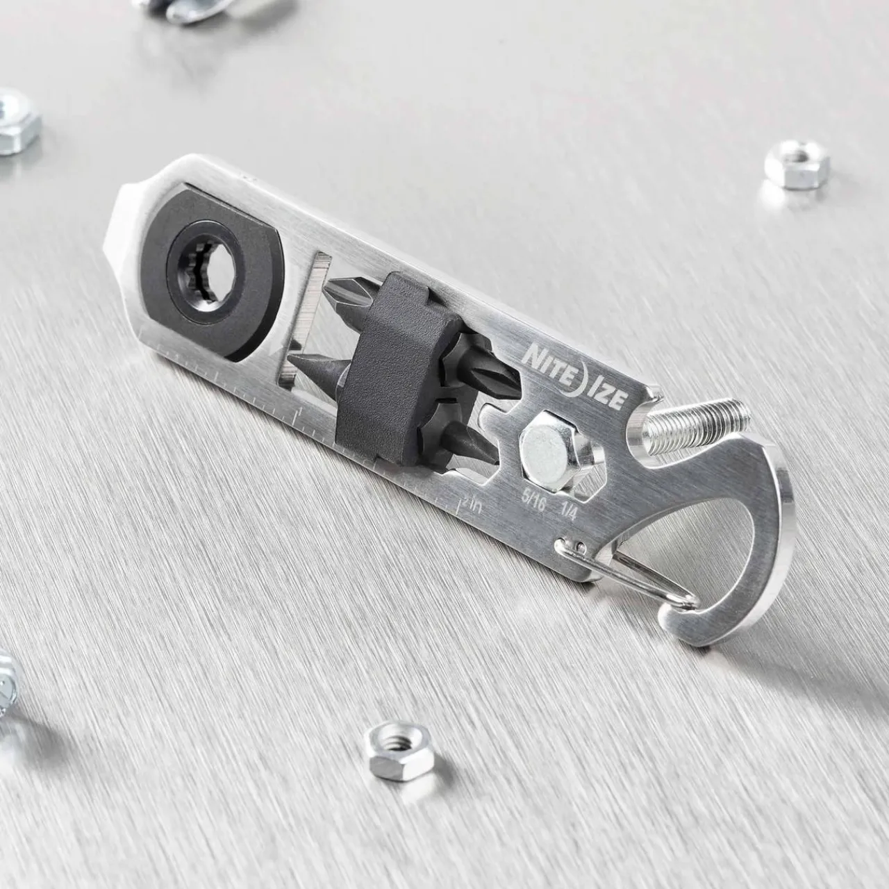For quick fixes and tight spaces, the DoohicKey Ratchet Tool is your helping hand, packing in a ratchet with 2 flat bits and 2 Phillips bits, plus a bottle opener, ruler, wrenches, pry tool, scoring point, and easy-to-carry carabiner clip.