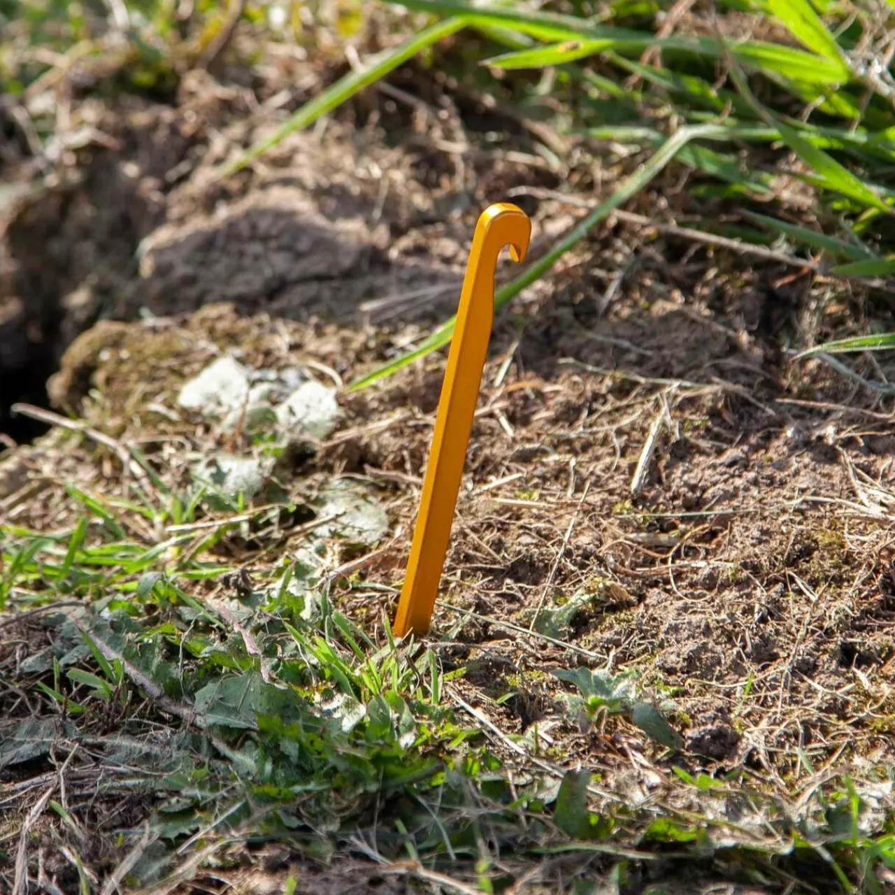 The Aluminium Tent Peg has a simple, durable design that provides a solid hold in hard ground. The classic squared shape is compact and lightweight yet strong enough to perform well in a range of ground conditions. With a good sized hook for keep guy lines in place this peg is highly effective. The gold colouring works well as it stands out in the ground when setting up and packing away.Â
