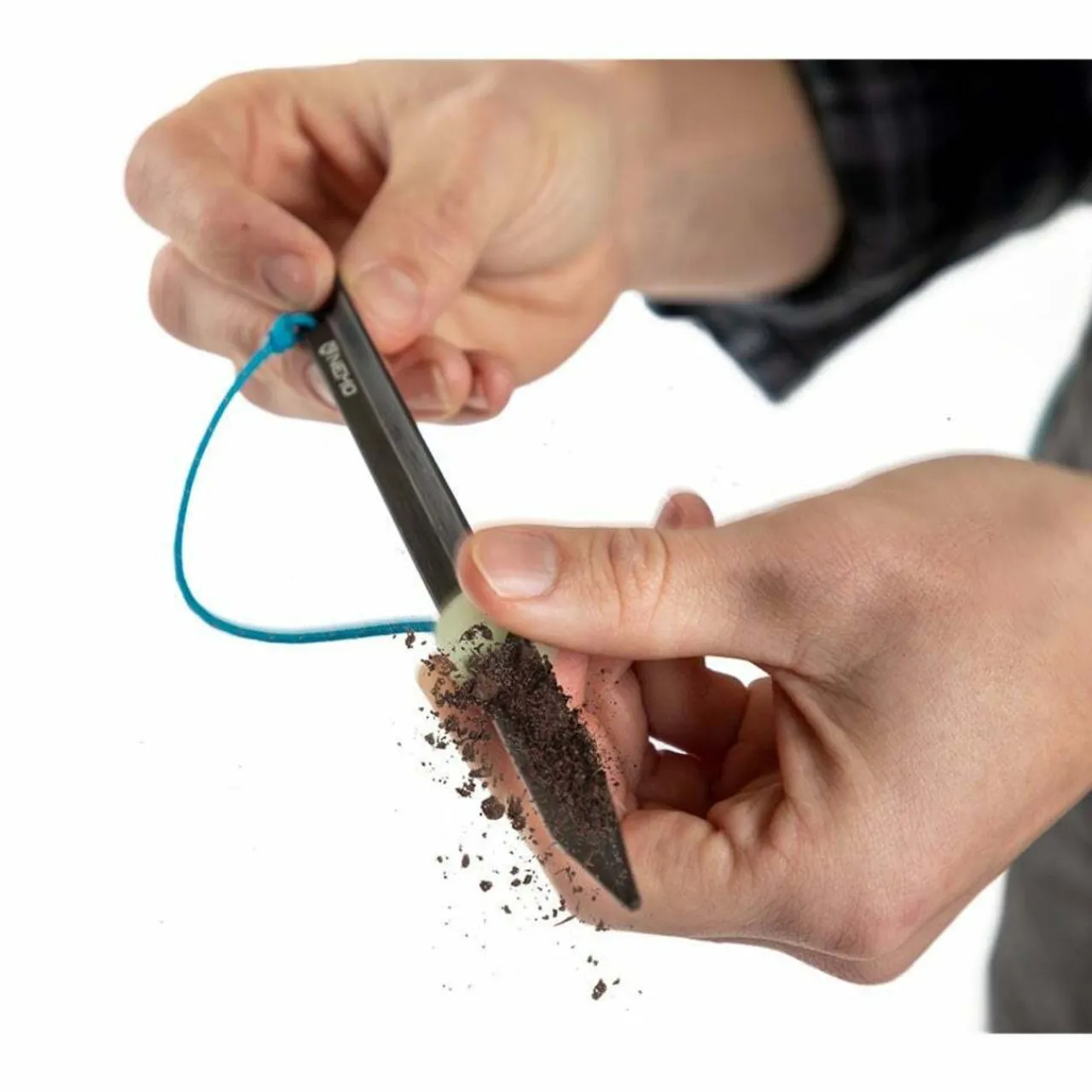 Sweepstakeâ„¢ eliminates the problem of dirt sticking to your tent stake. The durable, tethered polymer biscuit not only swipes your stake clean – it also glows in the dark, saving you from tripping on stakes and guylines at night.