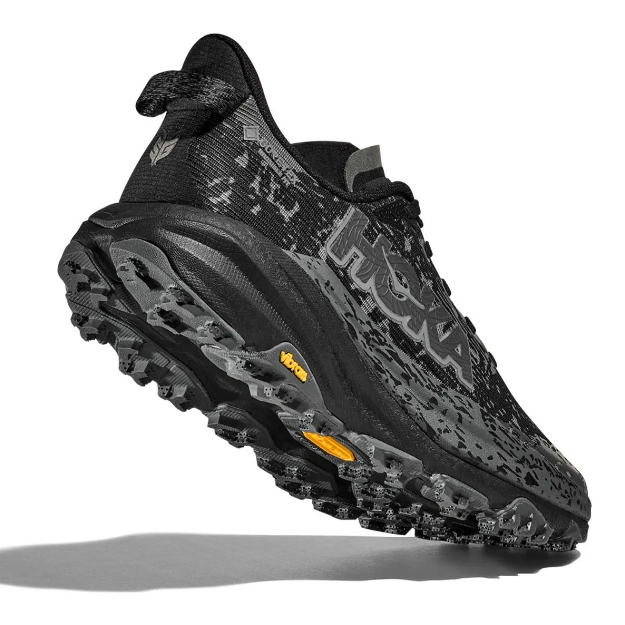 The Hoka Speedgoat 6 GTX is a trail-running powerhouse designed for technical terrain, blending comfort with aggressive traction. It remains lightweight at just 252g per shoe (UK6) without sacrificing durability. With a Vibram® Megagrip outsole and deep 5mm lugs, it grips confidently on wet, rocky, and muddy trails, ensuring stability on tricky surfaces.