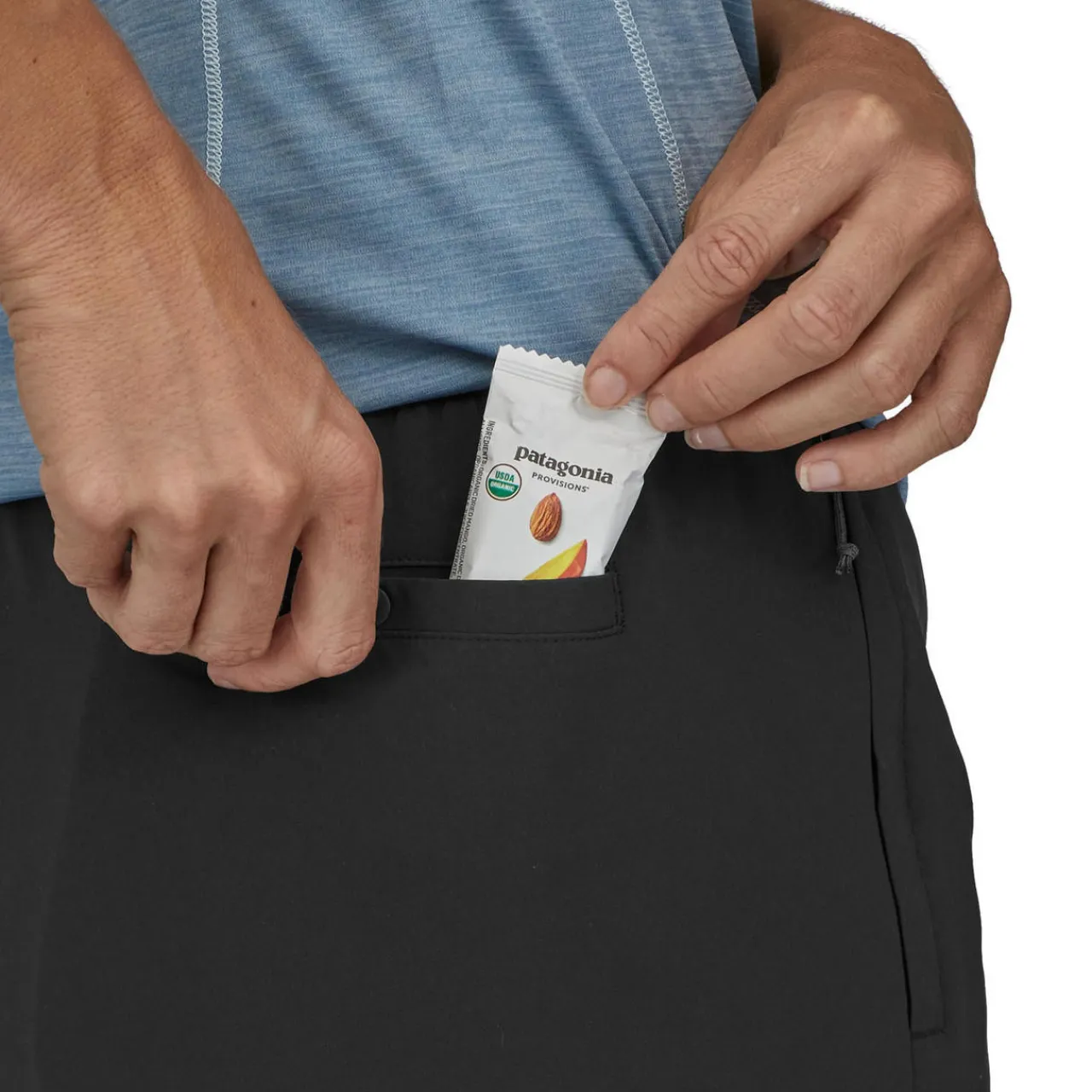 Patagonia Multi Trail Shorts shorts 5½“, are made from lightweight 90% recycled polyester and 10% spandex plain weave for 4-way stretch which gives these shorts the right amount of movement perfect for running. They have a soft brief-lining, elasticated waistband with a full drawcord which gives them a snug fit, and a small slit on the side seam for added freedom of movement. The drying loop is a convenient addition. These shorts also have 2 zipped front pockets and one rear press-studded pocket which is large enough for a mobile phone.