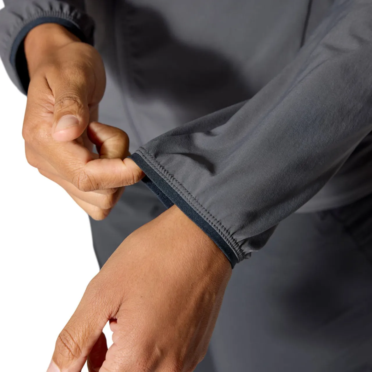 The under-helmet hood is simple but effective, and the single chest pocket is well placed, doubling as a stuff sack without fuss. Cuffs and hem are elasticated for a clean, no-frills finish, which suits the minimalist design. Light, breathable and just enough protection for big days on rock, ridge or trail.
