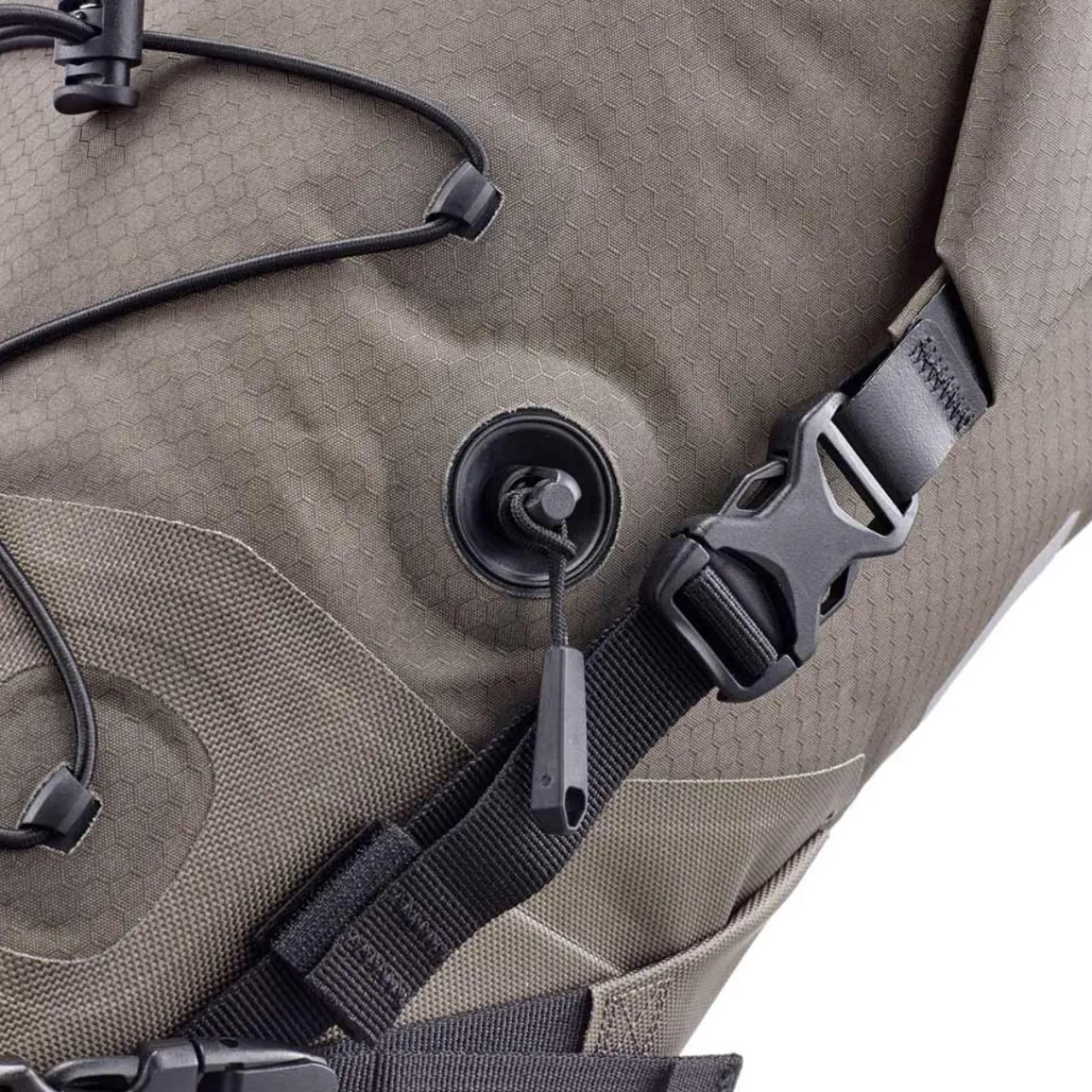 The ORTLIEB Seat-Pack 11L is compact and spacious at the same time. Offering a payload of 11 liters, the waterproof seat bag offers a lot of stowage space for sizeable items that are not so heavy such as clothing and personal care items. The inside and bottom of the bag are stiffened, which ensures stability even in bumpy terrain. Thanks to the roll closure, adjustable straps and an additional compression valve, you can reduce your loaded Seat-Pack to an extremely compact size.