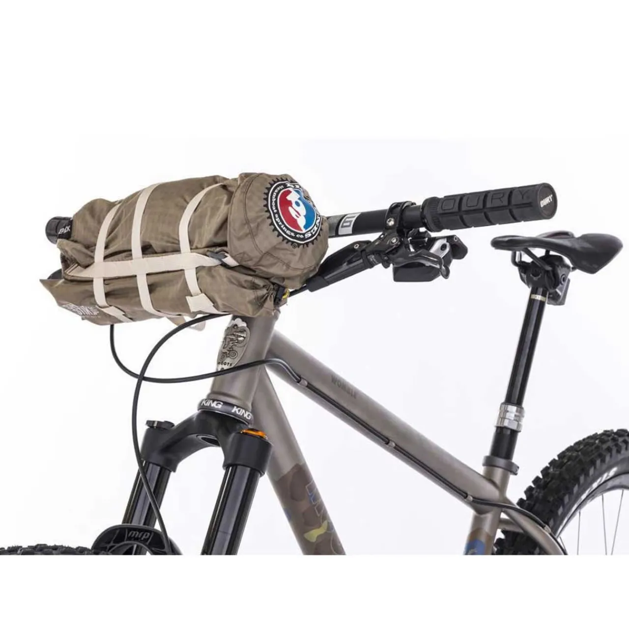 - Multiple bike-frame attachment configurations for burley compression stuff sack with daisy-chain webbing system